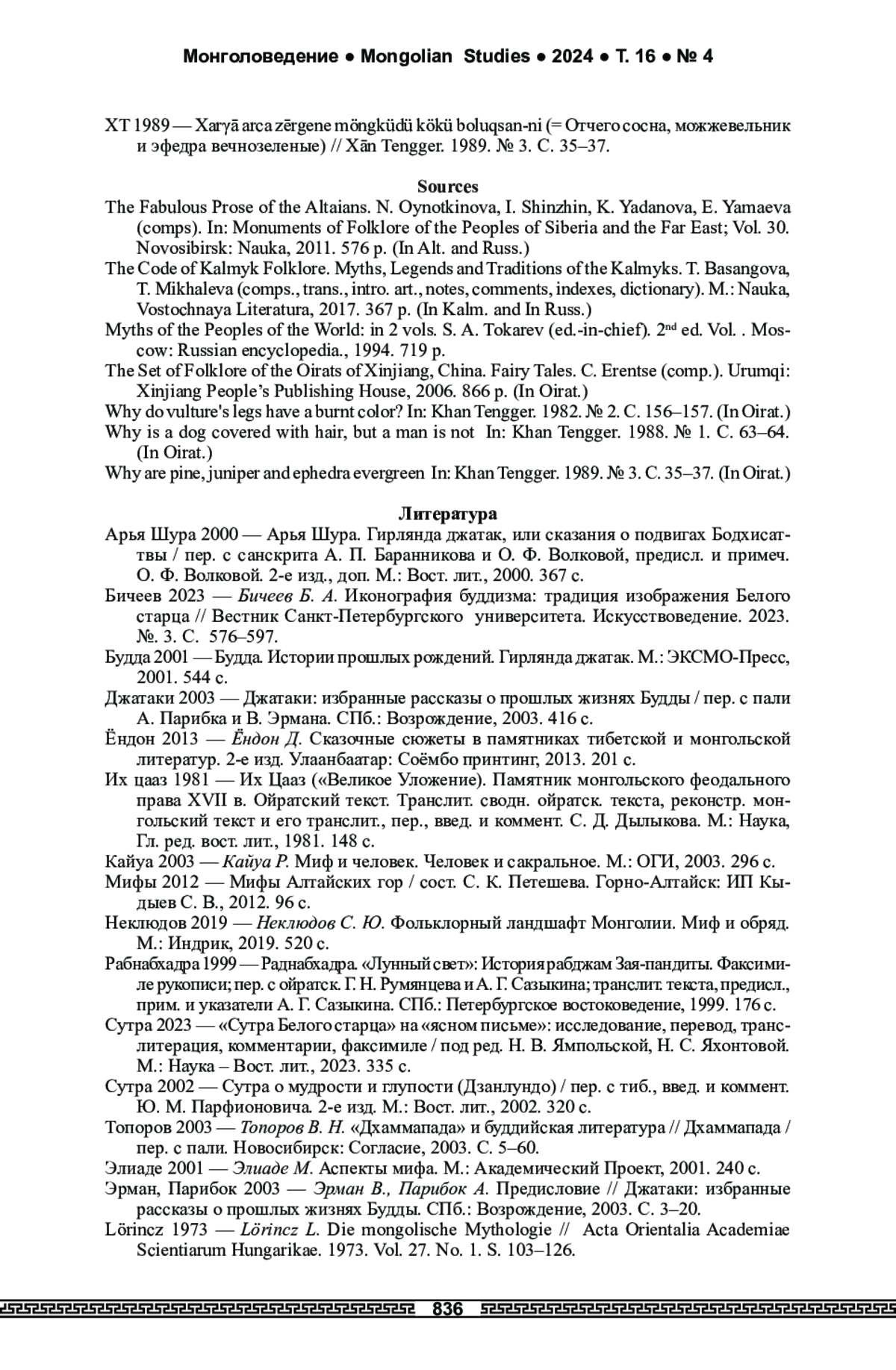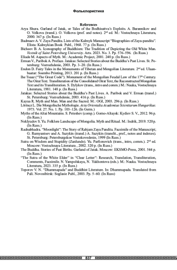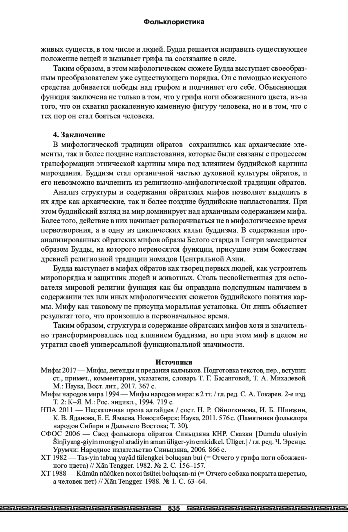 1. Мифы 2017 - Мифы, легенды и предания калмыков. Подготовка текстов, пер., вступит. ст., примеч., комментарии, указатели, словарь Т. Г. Басанговой, Т. А. Михалевой. М.: Наука, Вост. лит., 2017. 367 с.