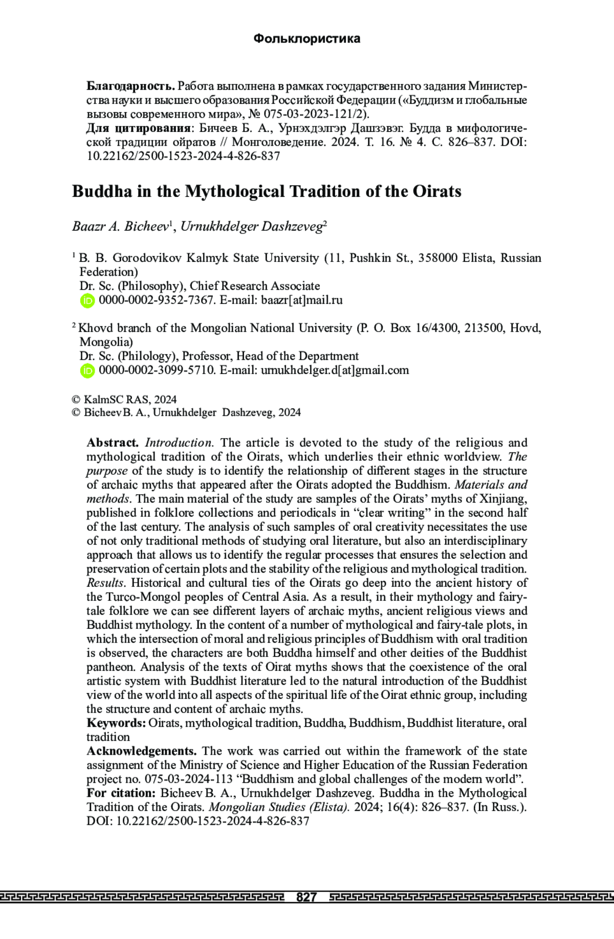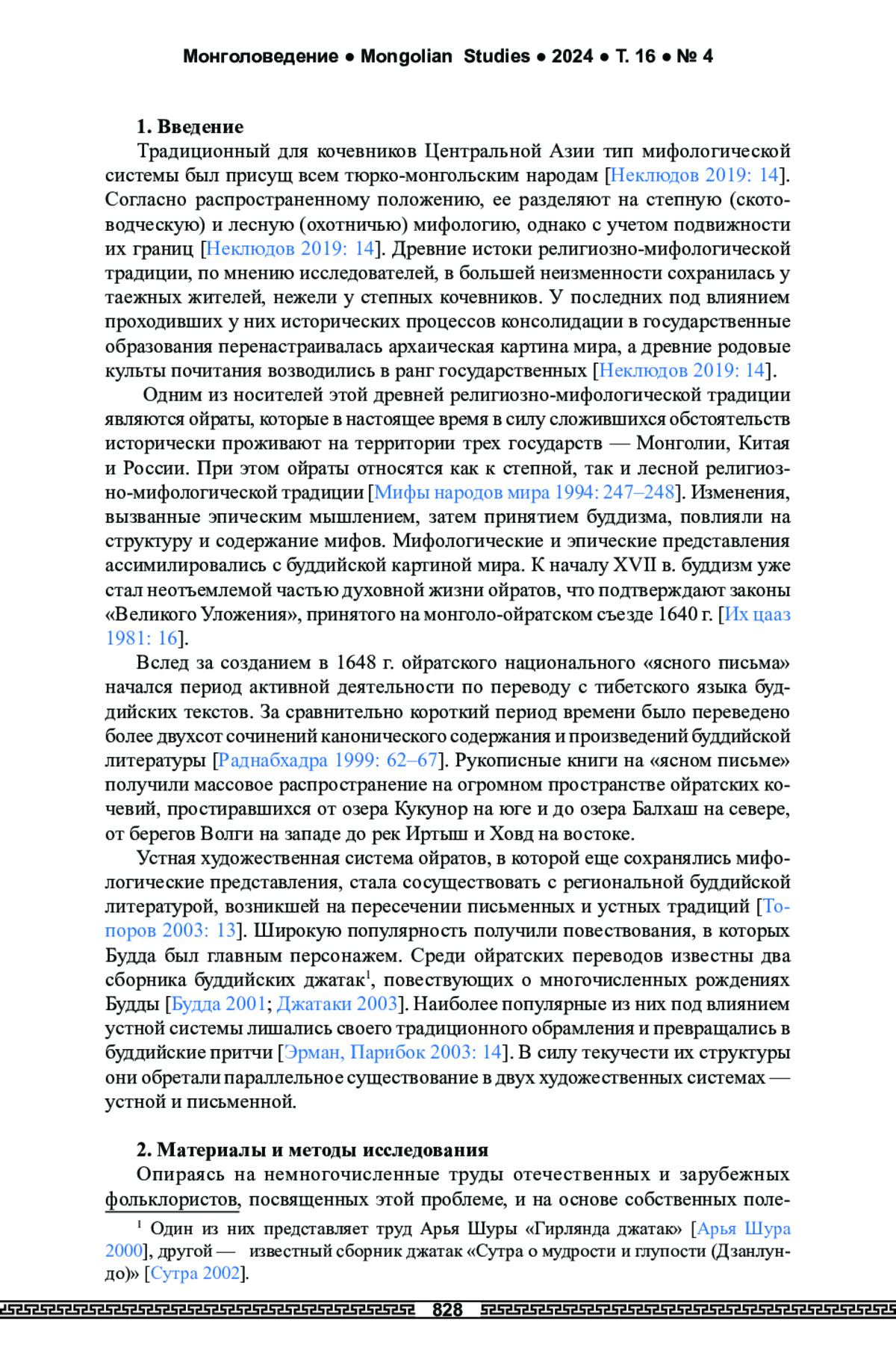 Исследователи высказывали разные точки зрения относительно буддийской мифологии в духовной культуре монгольских народов. Одни определяли ее как чуждую, другие — как ее органичную часть [Lörincz 1973: 104; Неклюдов 2019: 8]. Мы уже отмечали, что в XVII в. буддизм у ойратов трансформировал картину мира. Пожалуй, не осталось ни одного аспекта духовной культуры, куда бы ни внедрились элементы буддийского мировоззрения.