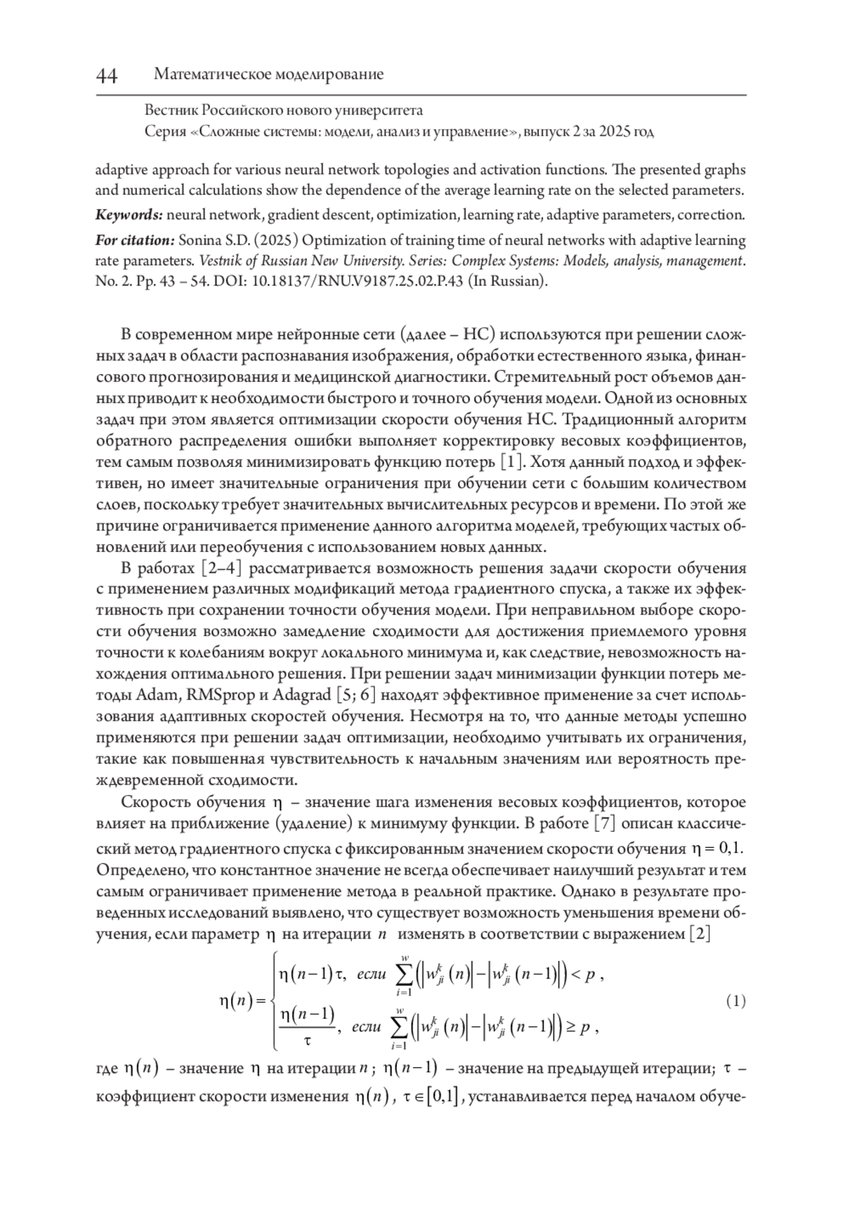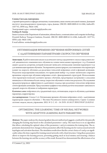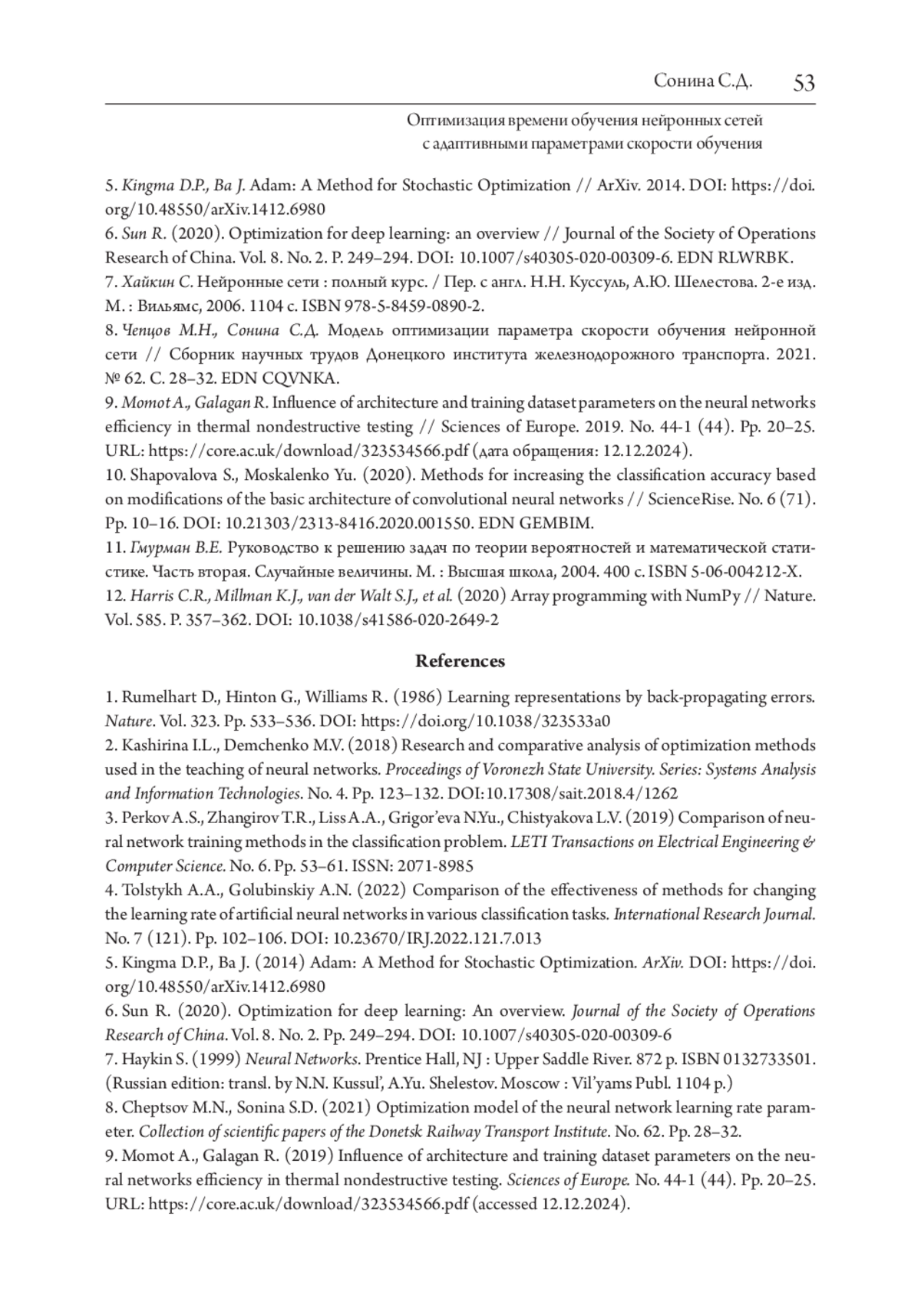 8. Чепцов М.Н., Сонина С.Д. Модель оптимизации параметра скорости обучения нейронной сети // Сборник научных трудов Донецкого института железнодорожного транспорта. 2021. № 62. С. 28-32. EDN: CQVNKA