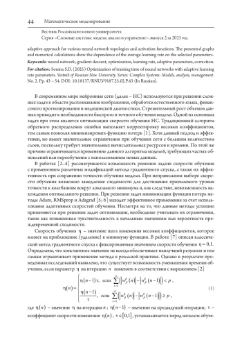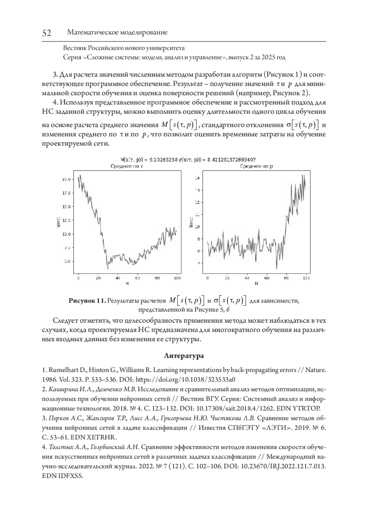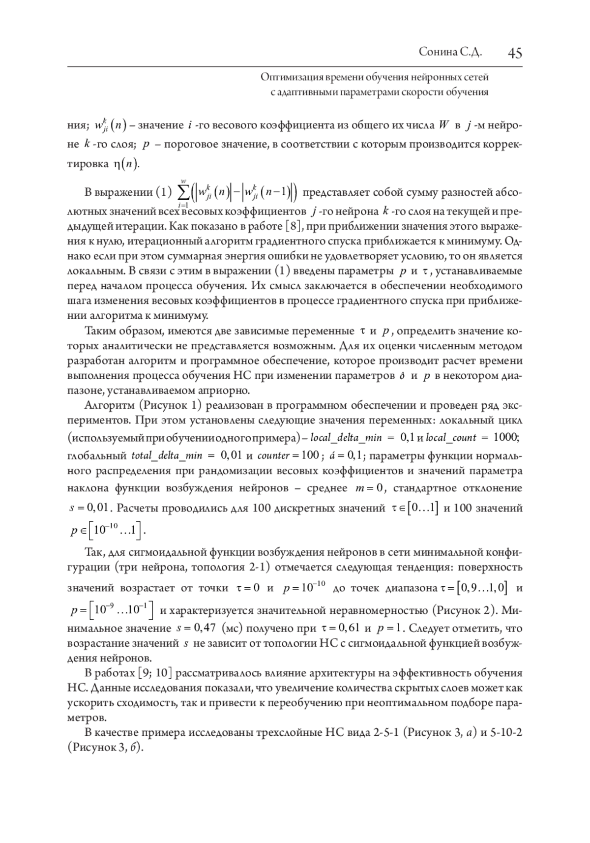 В работе выполнен анализ классического метода градиентного спуска и предложен способ динамического изменения шага обучения на основе вычисляемых параметров τ и p. Основной акцент сделан на алгоритме, который позволяет вычислять оптимальные значения параметров τ и p для минимизации времени обучения. Эксперименты демонстрируют, как изменения этих параметров влияют на скорость обучения для различных топологий нейронных сетей и функций активации. Результаты моделирования показывают, что правильный выбор τ и p может значительно сократить временные затраты при обучении нейронных сетей с фиксированной структурой. Использование этих параметров позволяет улучшить процесс обучения, предотвращая застревание в локальных минимумах и обеспечивая баланс между скоростью обучения и точностью результата. Исследования продемонстрировали эффективность адаптивного подхода при различных топологиях нейронных сетей и функциях активации. Представленные графики и численные расчёты показывают зависимость средней скорости обучения от выбранных параметров.