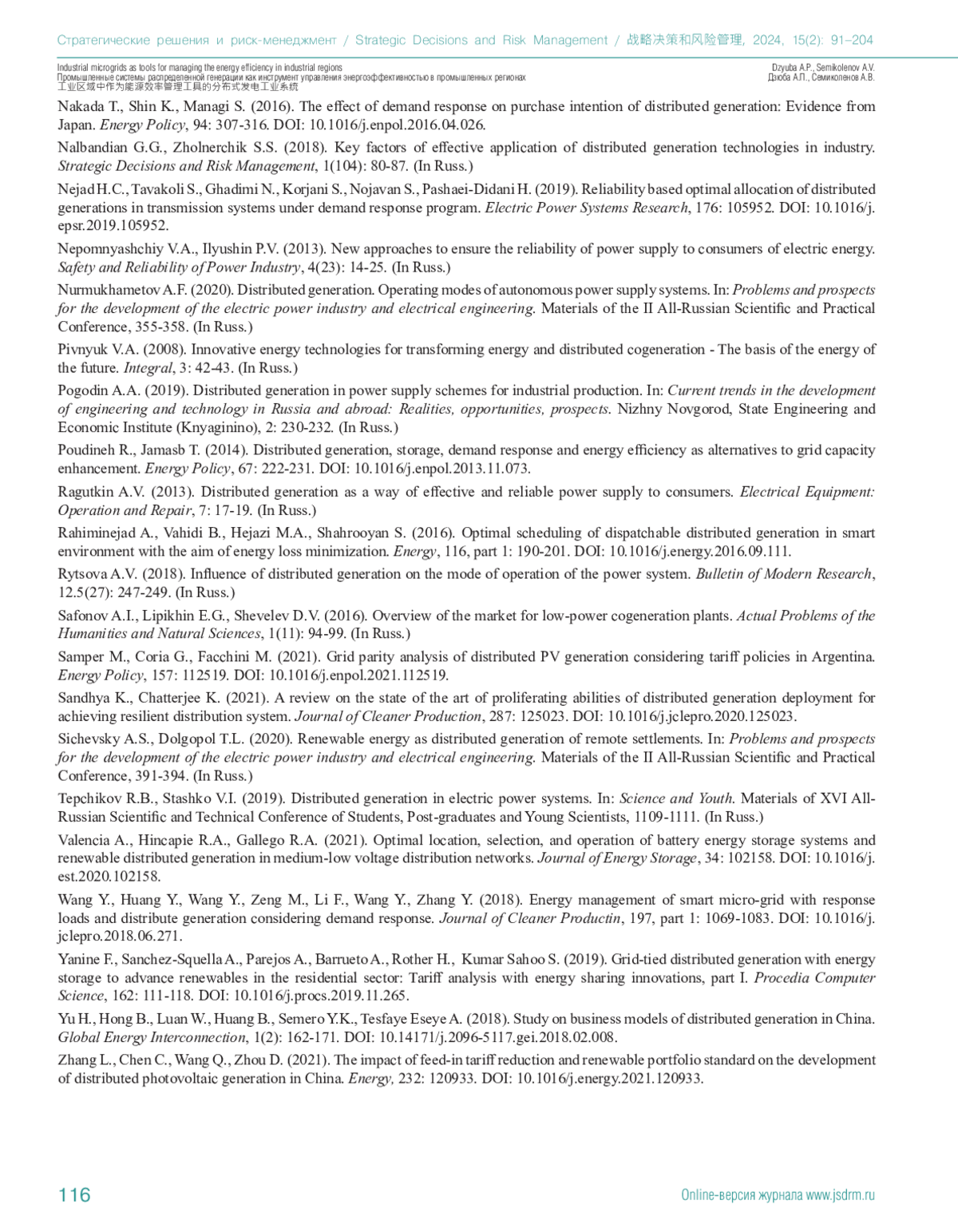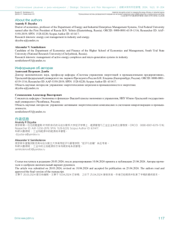 12. Dzyuba A.P., Semikolenov A.V. (2021a). Management of energy costs of industrial enterprises connected to electric grid of electric power producers. Bulletin of Kemerovo State University. Series: Political, Sociological, and Economic Sciences, 2(20). https://doi.org/10.21603/2500-3372-2021-6-2-198-207. (In Russ.)