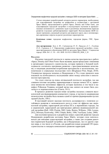 Статья описывает разработанный алгоритм расчета параметров, необходимых для классификации застройки на морфотипы в соответствии с методикой Space Matrix, представленной в работе Space, Density and Urban Form, для классификации городской застройки и последующего изучения ее функциональных возможности с решением задач в различные эволюционные периоды развития отдельных урбанизированных территорий. Использование QGIS позволит применять указанный алгоритм для широкого круга лиц и оптимизировать временные затраты на расчет различных характеристик.
