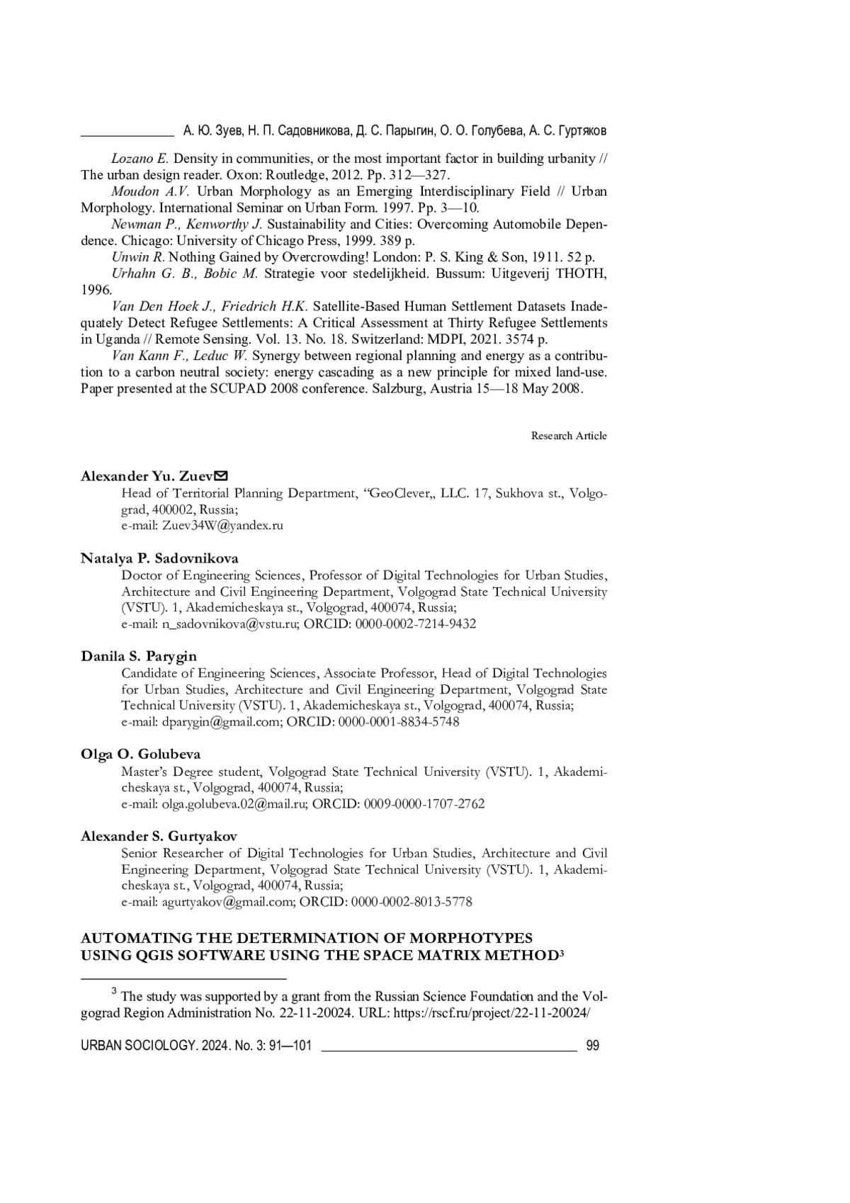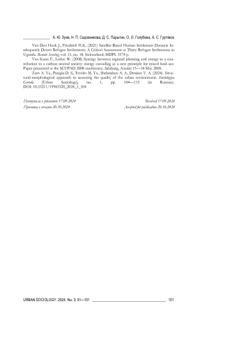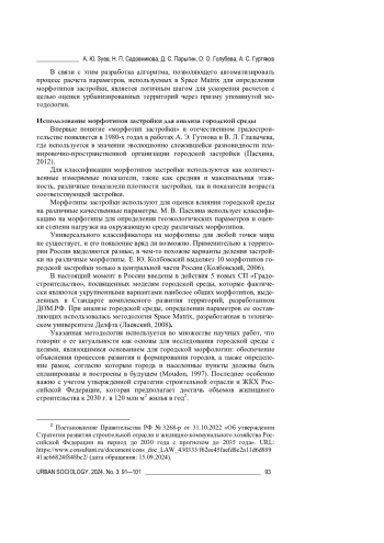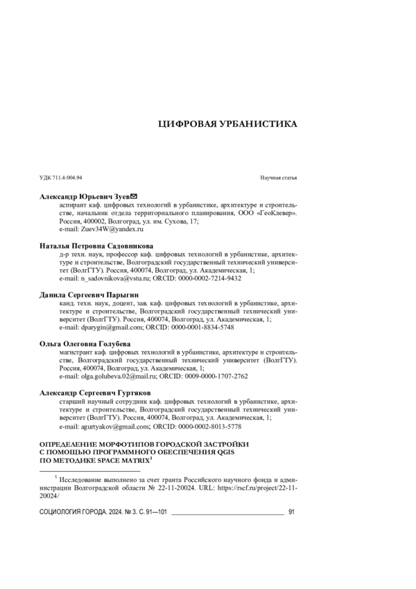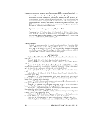 1. Зуев А. Ю., Парыгин Д. С., Тевелев М. Ю., Шебаршов А. А., Денисов В. А. Структурно-морфологический подход к оценке качества городской среды // Социология города. 2024. № 1. С. 104-115. DOI: 10.35211/19943520_2024_1_104 EDN: EFIZGH