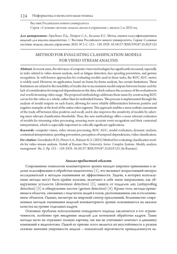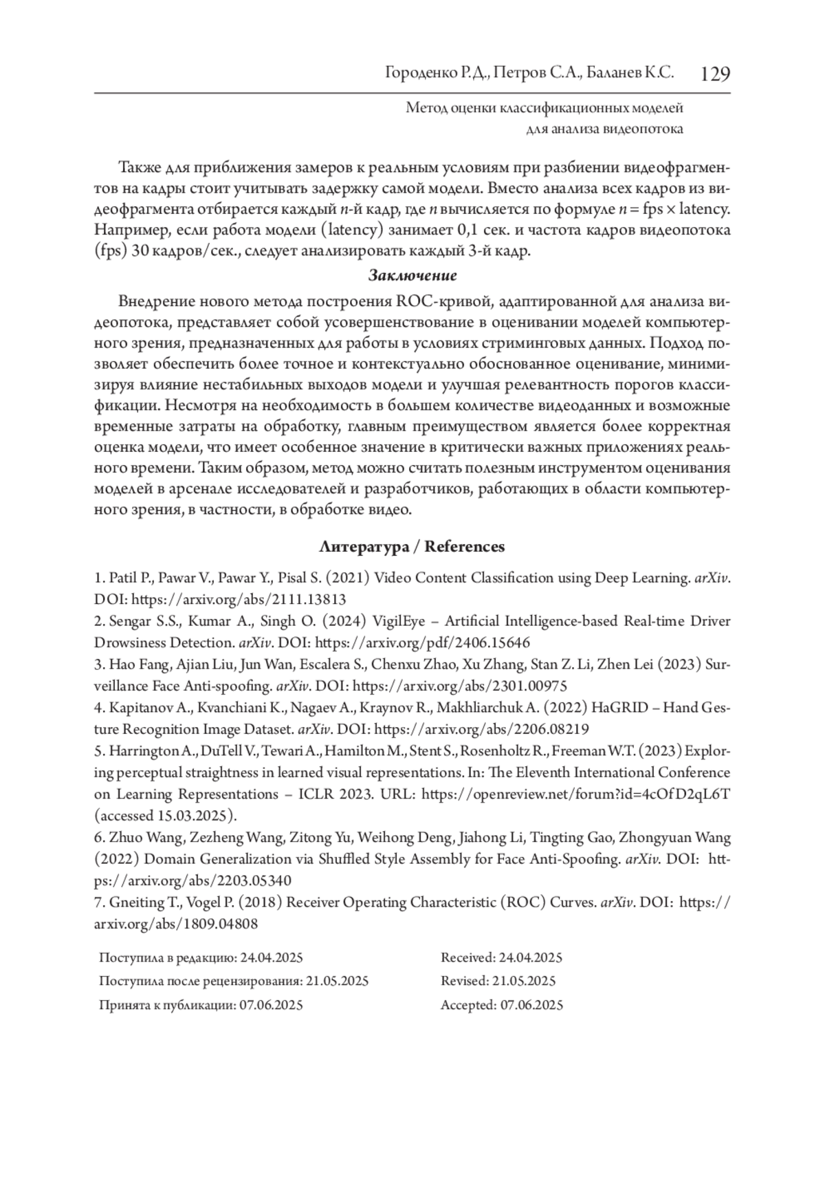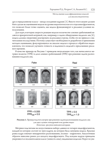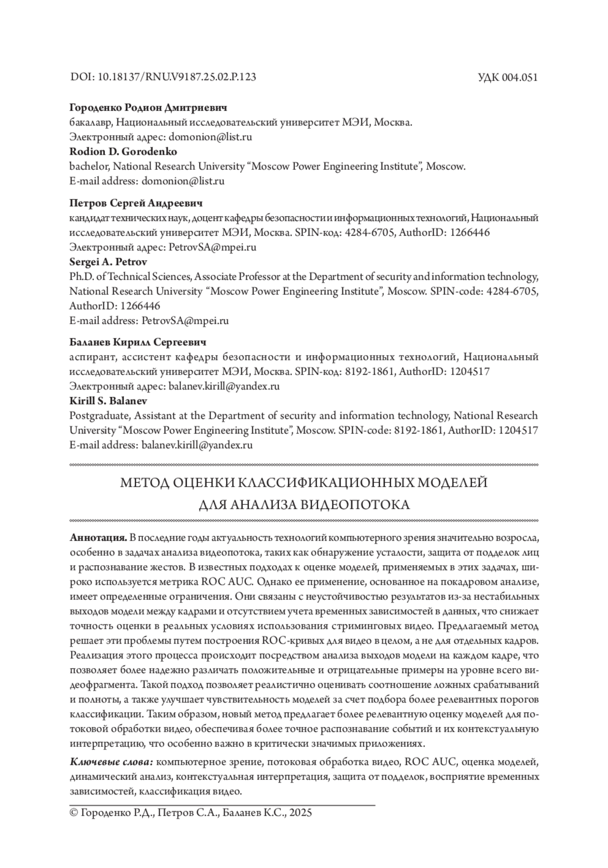 Современные технологии компьютерного зрения находят широкое применение в задачах классификации и обработки видеопотока [1], что вызывает возрастающий интерес исследователей к методам оценивания их эффективности. Задачи, в которых используемые методы могут быть крайне полезны, включают в себя такие направления, как обнаружение усталости (drowsiness detection) [2], защита от подделок лиц (antispoofing detection) [3] и обнаружение жестов (gesture detection) [4]. Кроме того, методы применимы в областях, связанных с подсчетом людей в толпе, распознаванием лиц и отслеживанием объектов. Однако, несмотря на широкий спектр приложений, большинство современных методов оценивания моделей компьютерного зрения основываются на анализе качества на уровне отдельных кадров.