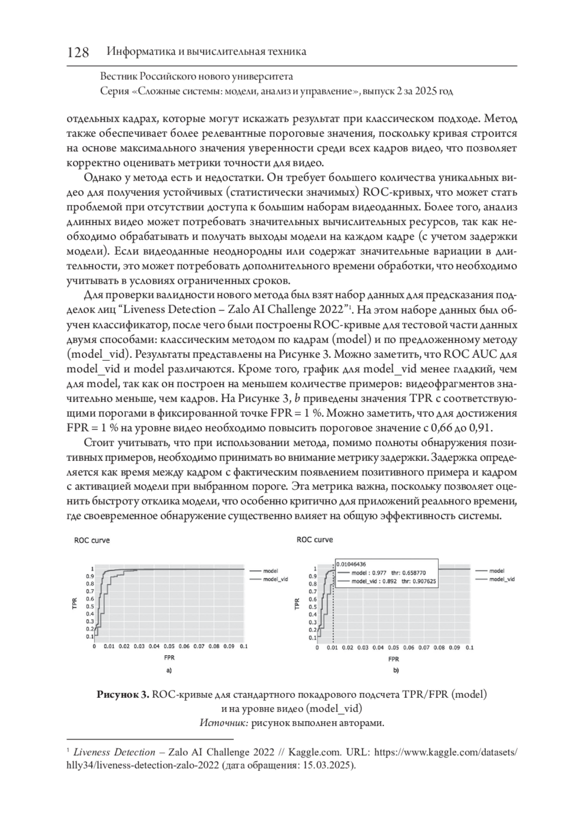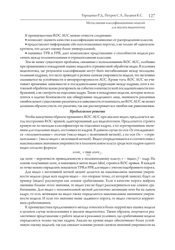 В последние годы актуальность технологий компьютерного зрения значительно возросла, особенно в задачах анализа видеопотока, таких как обнаружение усталости, защита от подделок лиц и распознавание жестов. В известных подходах к оценке моделей, применяемых в этих задачах, широко используется метрика ROC AUC. Однако ее применение, основанное на покадровом анализе, имеет определенные ограничения. Они связаны с неустойчивостью результатов из-за нестабильных выходов модели между кадрами и отсутствием учета временных зависимостей в данных, что снижает точность оценки в реальных условиях использования стриминговых видео. Предлагаемый метод решает эти проблемы путем построения ROC-кривых для видео в целом, а не для отдельных кадров. Реализация этого процесса происходит посредством анализа выходов модели на каждом кадре, что позволяет более надежно различать положительные и отрицательные примеры на уровне всего видеофрагмента. Такой подход позволяет реалистично оценивать соотношение ложных срабатываний и полноты, а также улучшает чувствительность моделей за счет подбора более релевантных порогов классификации. Таким образом, новый метод предлагает более релевантную оценку моделей для потоковой обработки видео, обеспечивая более точное распознавание событий и их контекстуальную интерпретацию, что особенно важно в критически значимых приложениях.