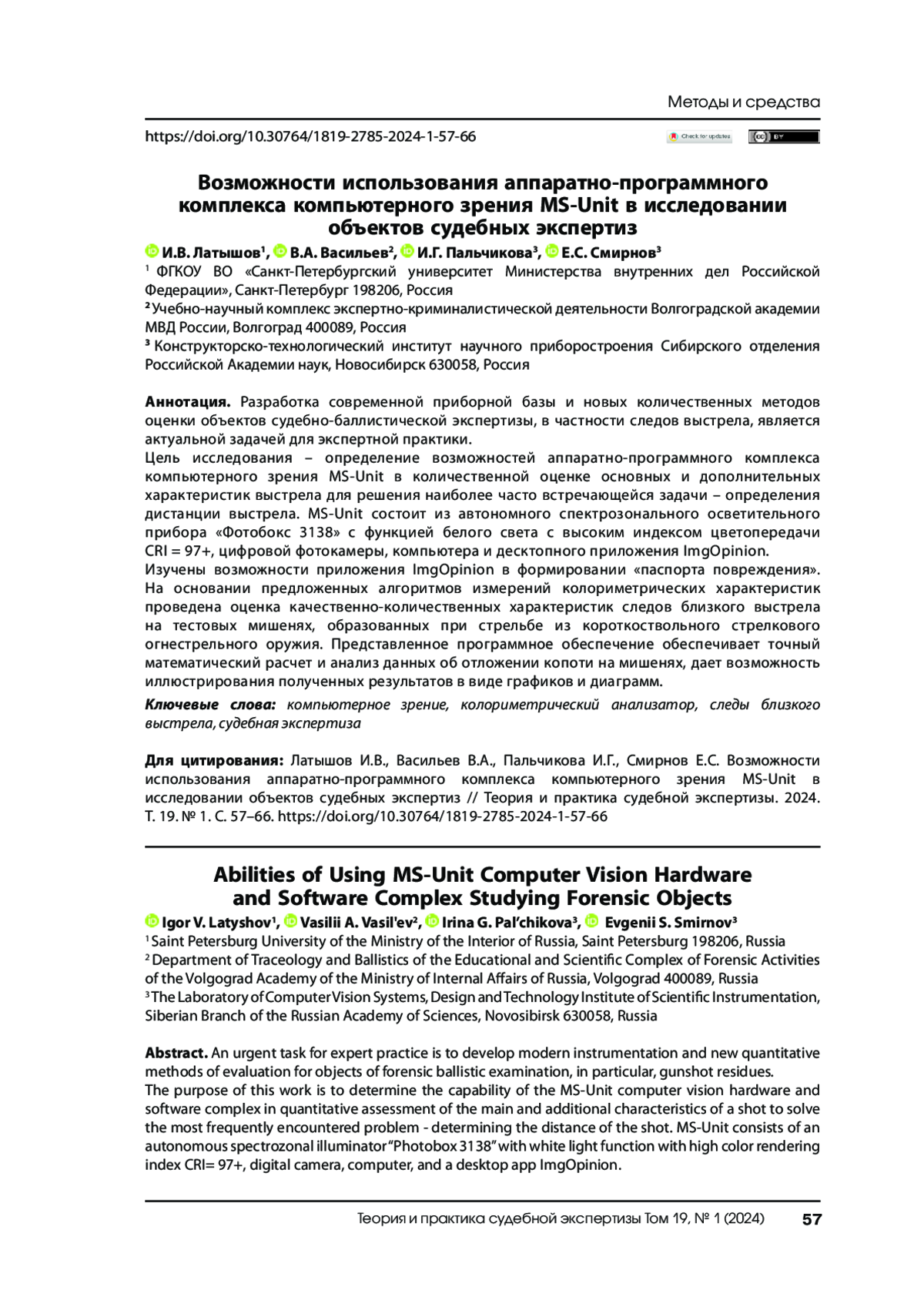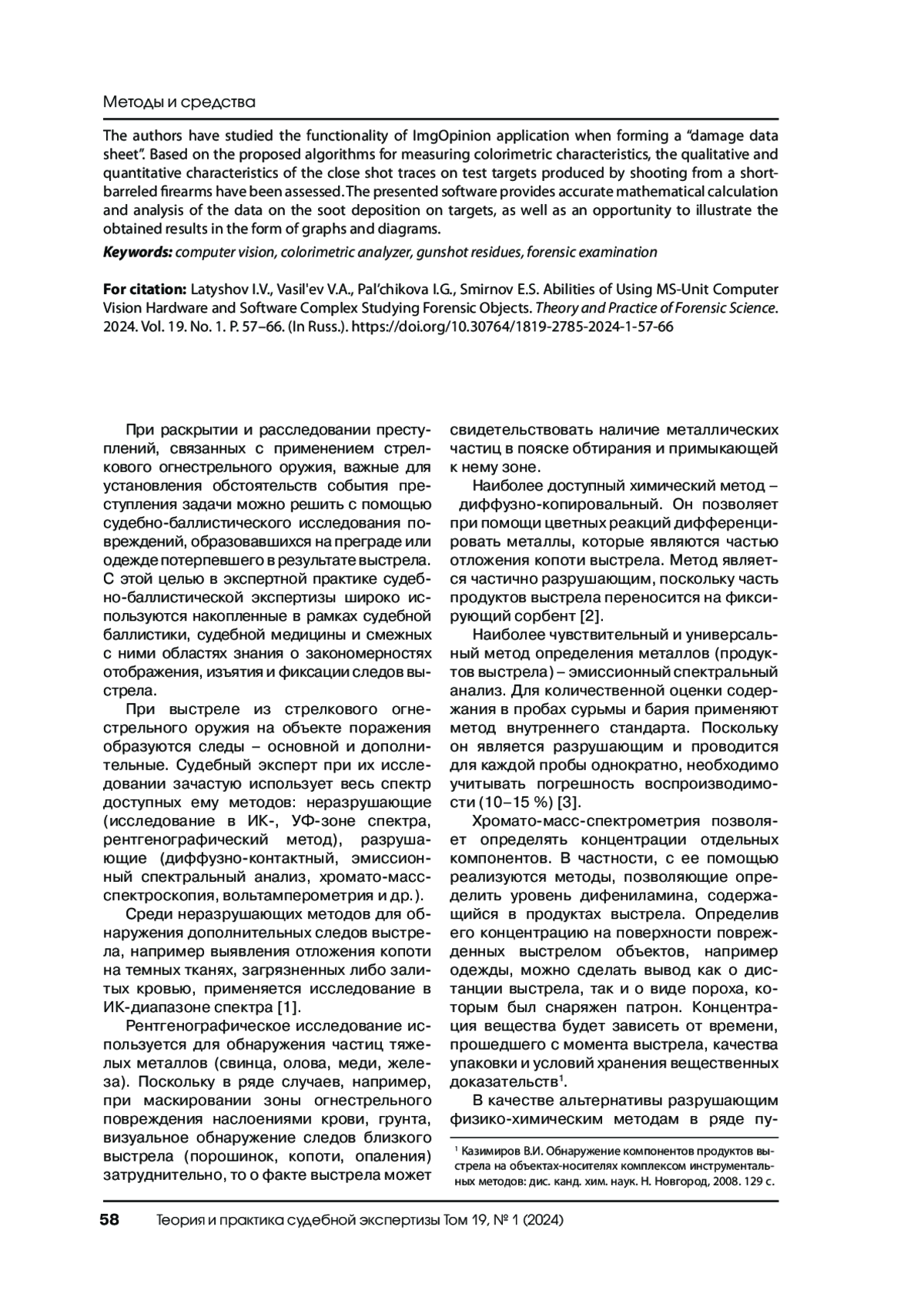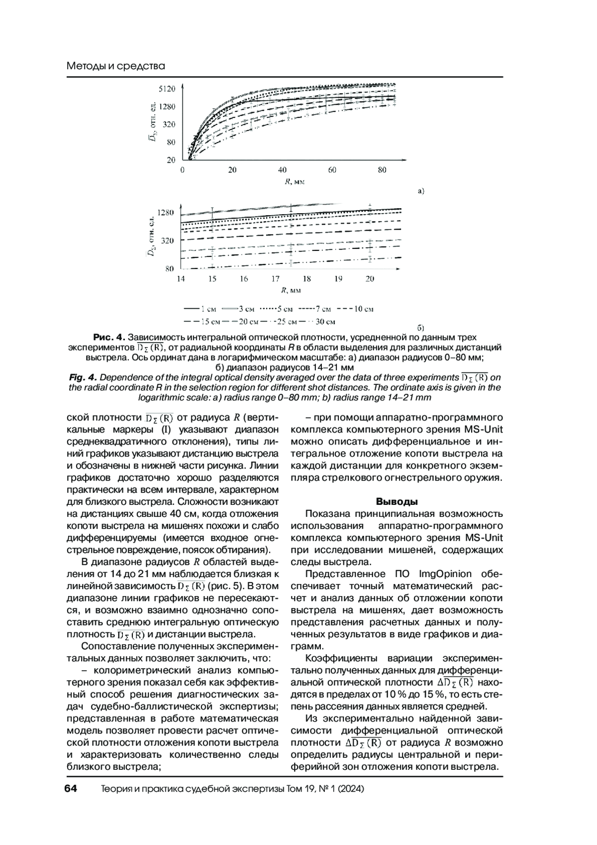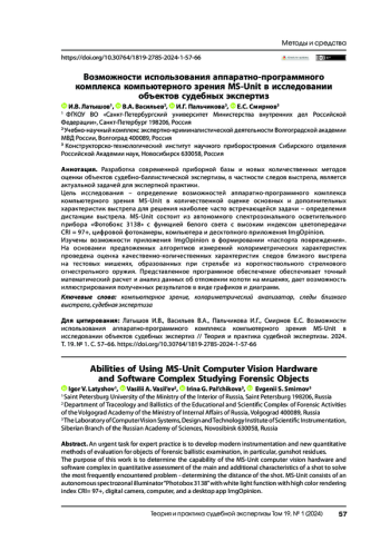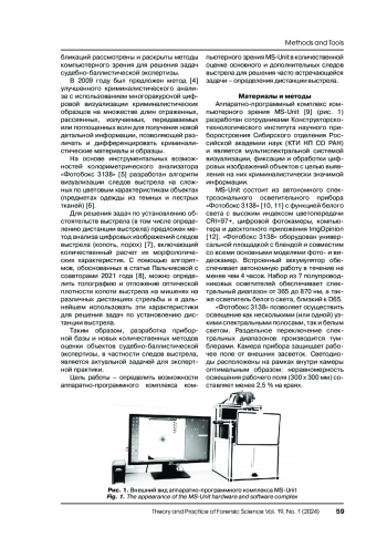 Разработка современной приборной базы и новых количественных методов оценки объектов судебно-баллистической экспертизы, в частности следов выстрела, является актуальной задачей для экспертной практики. Цель исследования – определение возможностей аппаратно-программного комплекса компьютерного зрения MS-Unit в количественной оценке основных и дополнительных характеристик выстрела для решения наиболее часто встречающейся задачи – определения дистанции выстрела. MS-Unit состоит из автономного спектрозонального осветительного прибора «Фотобокс 3138» с функцией белого света с высоким индексом цветопередачи CRI = 97+, цифровой фотокамеры, компьютера и десктопного приложения ImgOpinion. Изучены возможности приложения ImgOpinion в формировании «паспорта повреждения». На основании предложенных алгоритмов измерений колориметрических характеристик проведена оценка качественно-количественных характеристик следов близкого выстрела на тестовых мишенях, образованных при стрельбе из короткоствольного стрелкового огнестрельного оружия. Представленное программное обеспечение обеспечивает точный математический расчет и анализ данных об отложении копоти на мишенях, дает возможность иллюстрирования полученных результатов в виде графиков и диаграмм.