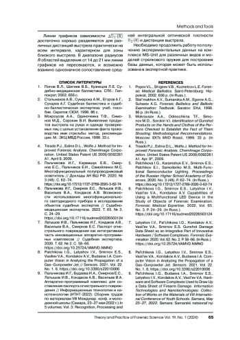 7. Латышов И.В., Пальчикова И.Г., Кондаков А.В., Васильев В.А., Смирнов Е.С. Паспорт огнестрельного повреждения как интегративная часть инновационных аппаратно-программных комплексов // Судебная экспертиза. 2020. Т. 62. № 2. С. 58-66. https://doi.org/10.25724/VAMVD.NMNO