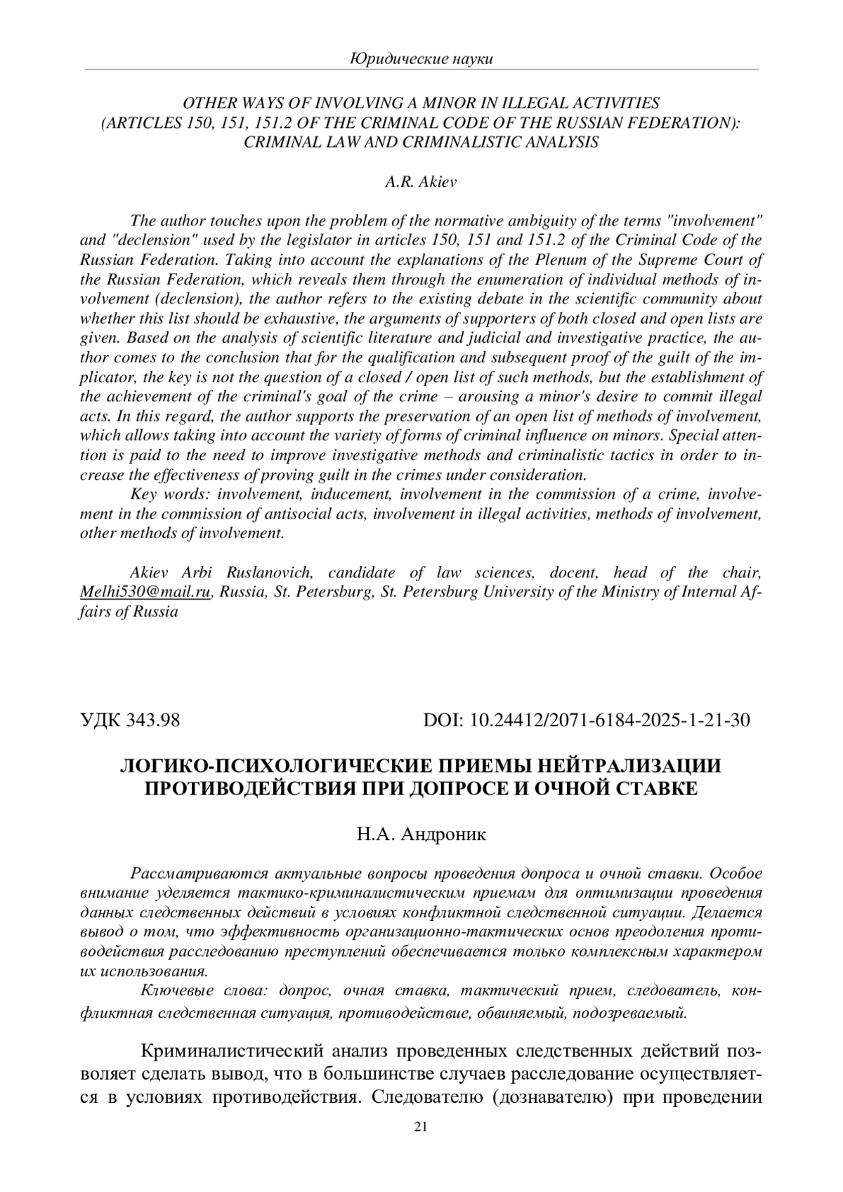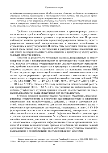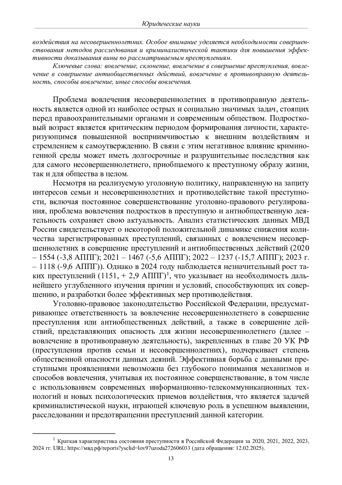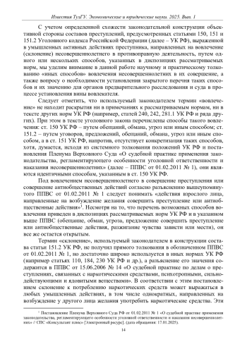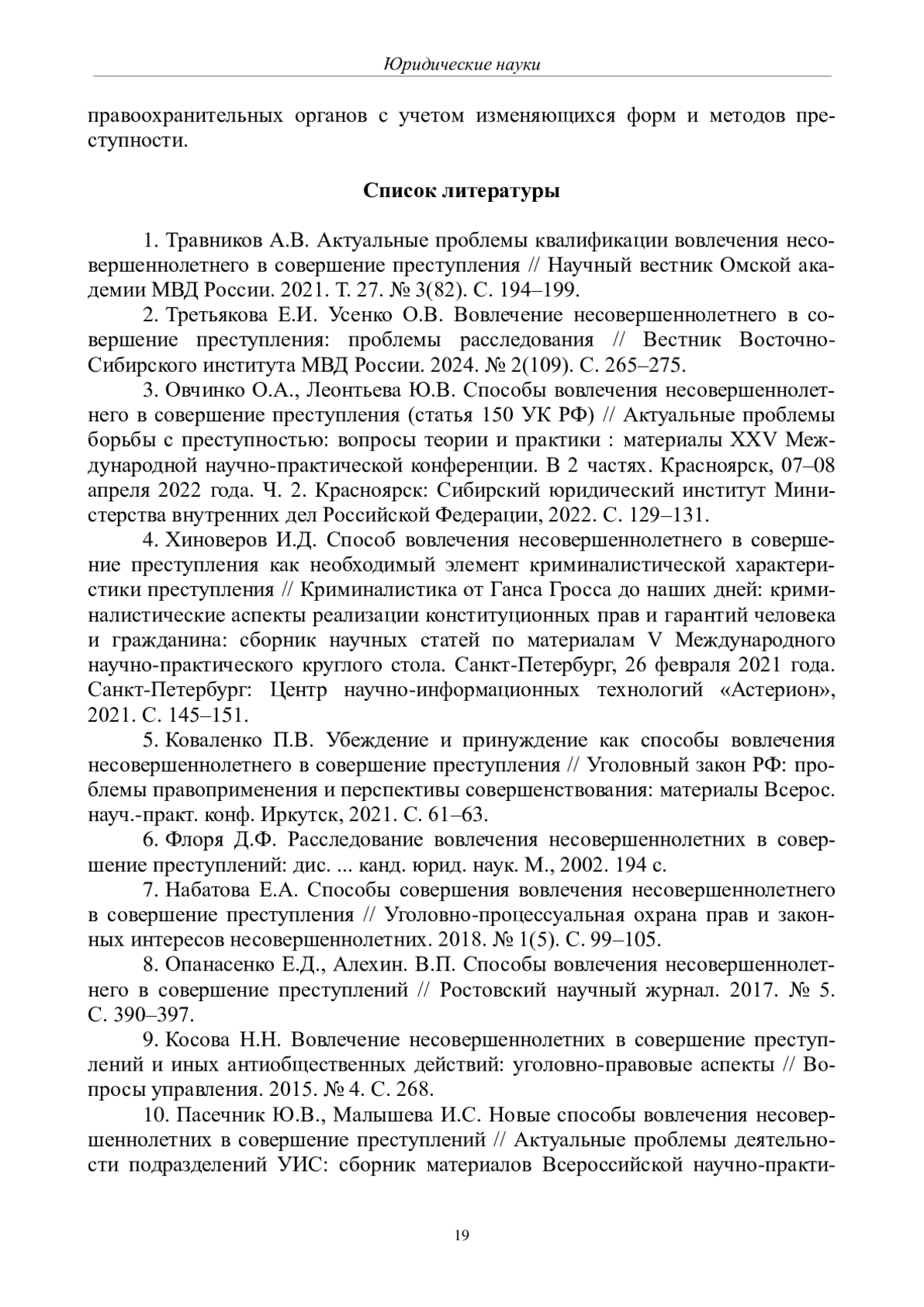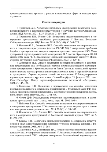 1. Травников А.В. Актуальные проблемы квалификации вовлечения несовершеннолетнего в совершение преступления // Научный вестник Омской академии МВД России. 2021. Т. 27. № 3(82). С. 194-199. EDN: PPBGGB