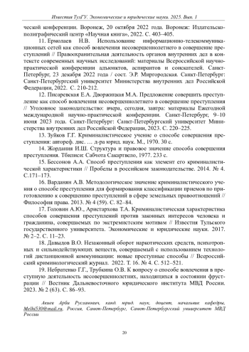 11. Ермолаев Н.В. Использование информационно - телекоммуникационных сетей как способ вовлечения несовершеннолетнего в совершение преступлений // Правоохранительная деятельность органов внутренних дел в контексте современных научных исследований: мат. Всерос. научно - практ. конференции адъюнктов, аспирантов и соискателей. 23 декабря 2022 года / сост. Э.Р. Миргородская. Санкт-Петербург: Санкт-Петербургский университет Министерства внутренних дел Российской Федерации, 2022. С. 210-212.