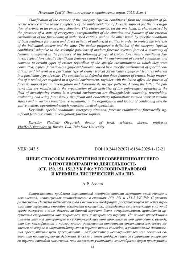 4. Хиноверов И.Д. Способ вовлечения несовершеннолетнего в совершение преступления как необходимый элемент криминалистической характеристики преступления // Криминалистика от Ганса Гросса до наших дней: криминалистические аспекты реализации конституционных прав и гарантий человека и гражданина: сб. научных статей по материалам V Международного научно - практического круглого стола. 26 февраля 2021 года. Санкт-Петербург: Центр научно - информационных технологий “Астерион”, 2021. С. 145-151. EDN: KLMRDE
