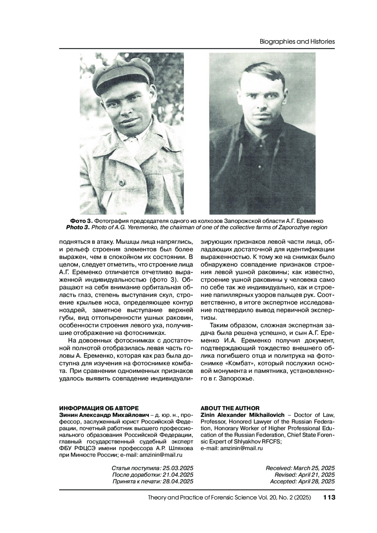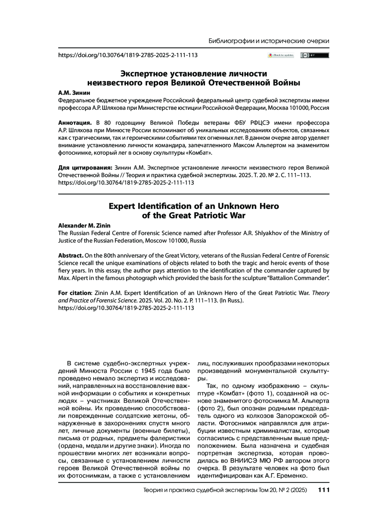 ЗИНИН А. М. ЭКСПЕРТНОЕ УСТАНОВЛЕНИЕ ЛИЧНОСТИ НЕИЗВЕСТНОГО ГЕРОЯ ВЕЛИКОЙ ОТЕЧЕСТВЕННОЙ ВОЙНЫ // ТЕОРИЯ И ПРАКТИКА СУДЕБНОЙ ЭКСПЕРТИЗЫ. 2025. ТОМ 20, №2
