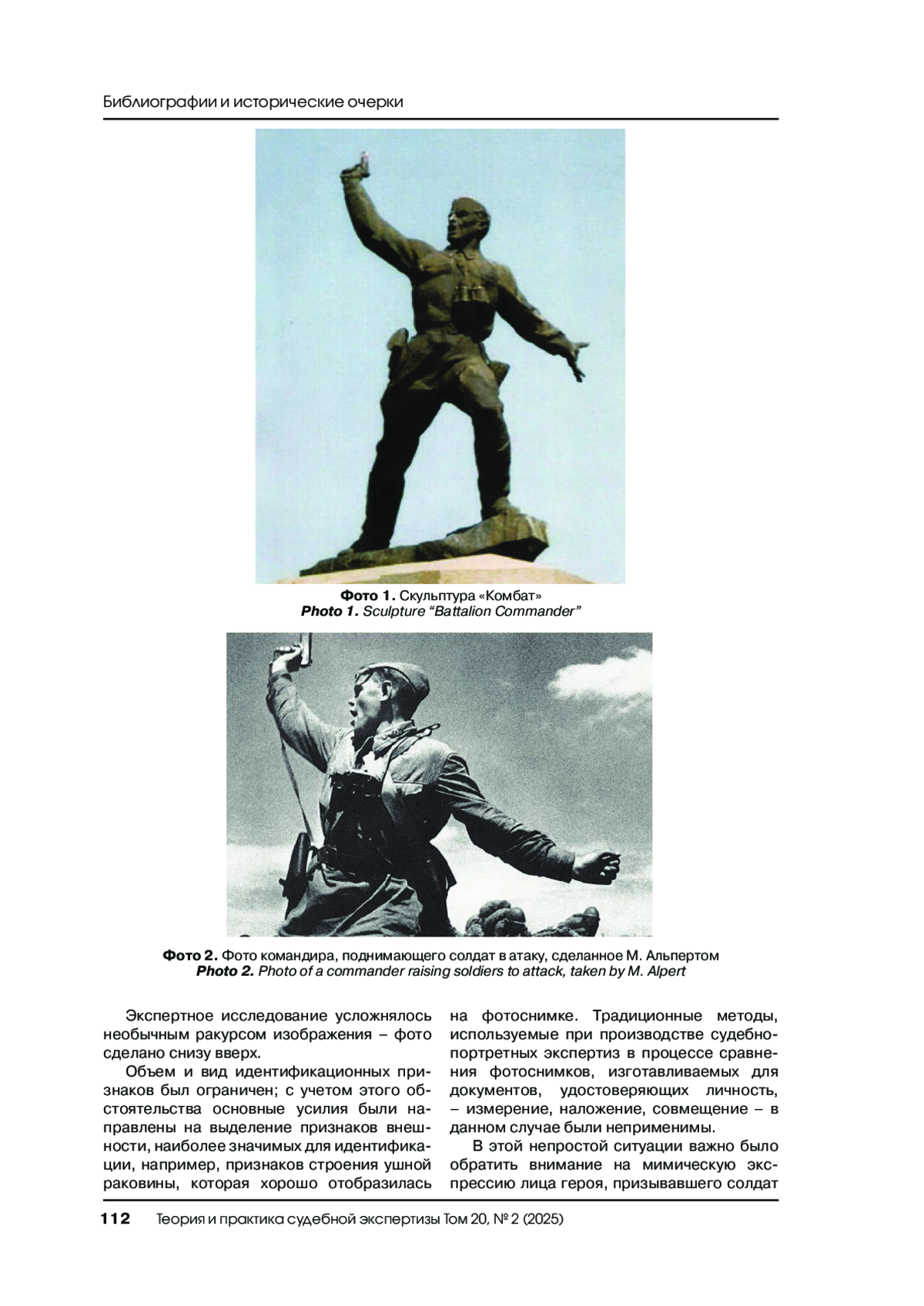 В 80 годовщину Великой Победы ветераны ФБУ РФЦСЭ имени профессора А. Р. Шляхова при Минюсте России вспоминают об уникальных исследованиях объектов, связанных как с трагическими, так и героическими событиями тех огненных лет. В данном очерке автор уделяет внимание установлению личности командира, запечатленного Максом Альпертом на знаменитом фотоснимке, который лег в основу скульптуры «Комбат».