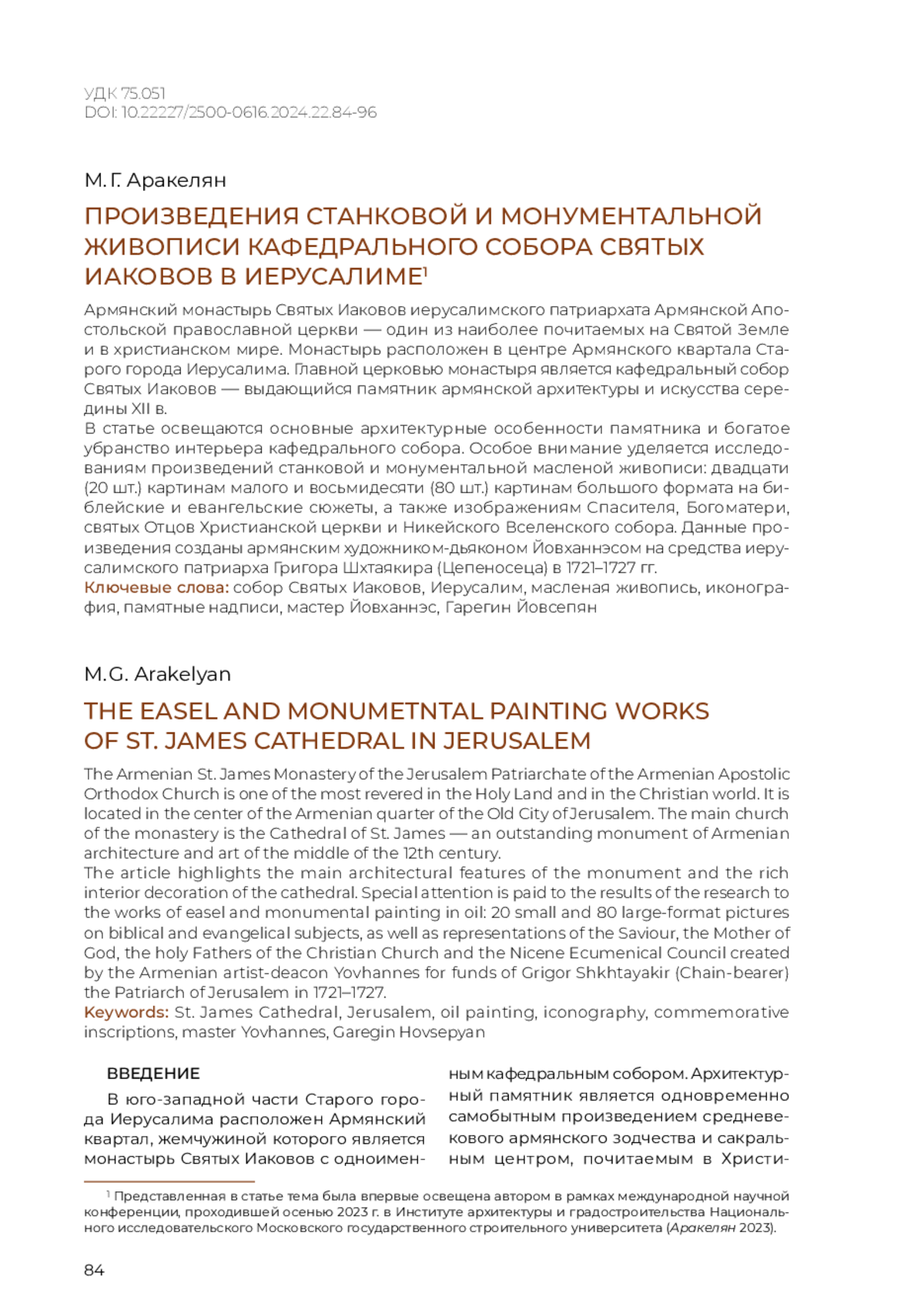 3. Аракелян 2023 - Аракелян М. Г. Живописная программа кафедрального собора Святых Иаковов в Иерусалиме (XVIII век) // Материалы международной научной конференции «Вопросы всеобщей истории архитектуры». Москва, 19-20 сентября 2023 г. М.: НИУ МГСУ, 2023. URL: https://archi.ru/elpub/99082/m-g-arakelyan-zhivopisnaya-programma-kafedralnogo-sobora-svyatykh-iakovov-v-ierusalime-xviii-vek