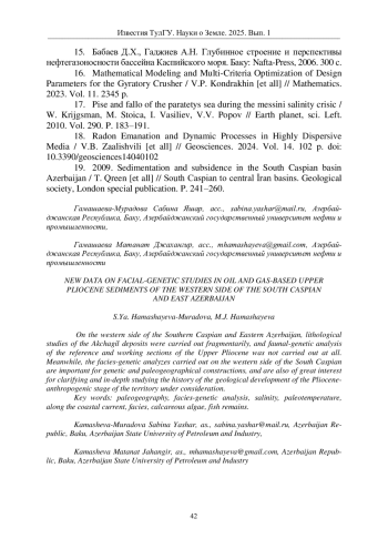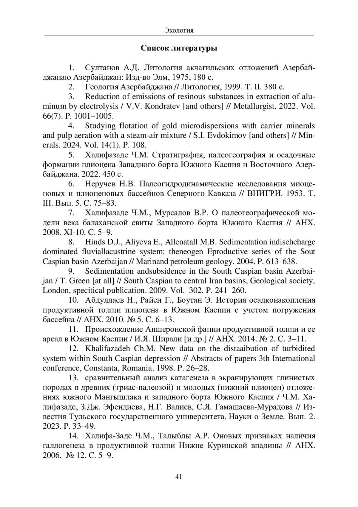 13. Сравнительный анализ катагенеза в экранирующих глинистых породах в древних (триас-палеозой) и молодых (нижний плиоцен) отложениях южного Мангышлака и западного борта Южного Каспия / Ч.М. Халифазаде, З.Дж. Эфендиева, Н.Г. Валиев, С.Я. Гамашаева-Мурадова // Известия Тульского государственного университета. Науки о Земле. Вып. 2. 2023. P. 33-49.