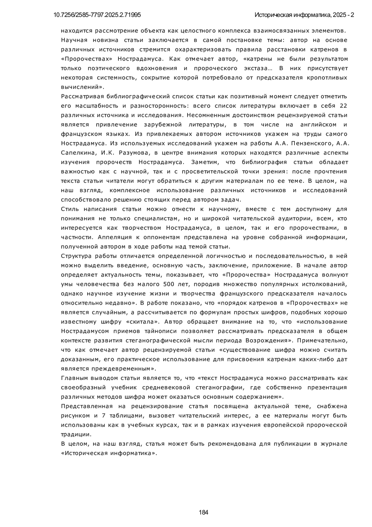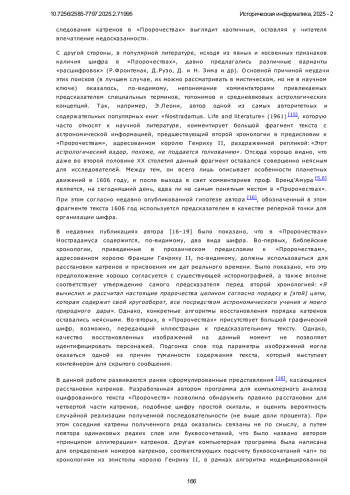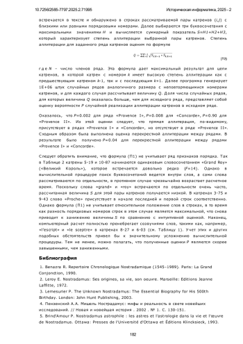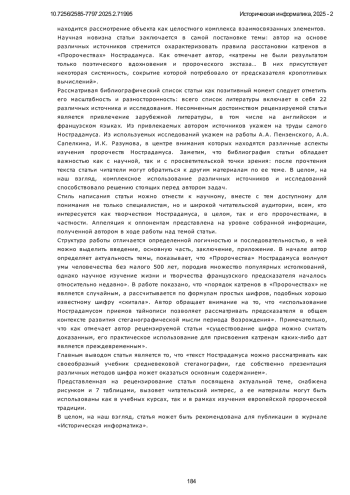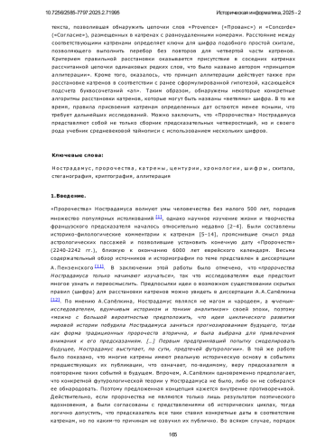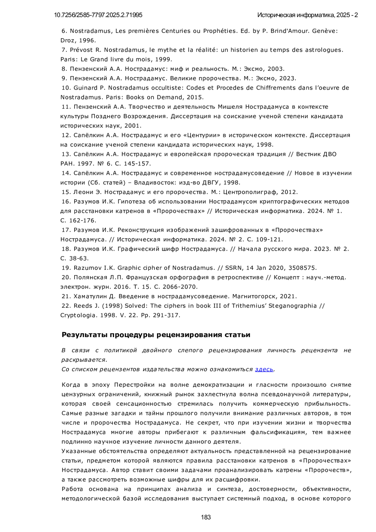 16. Разумов И.К. Гипотеза об использовании Нострадамусом криптографических методов для расстановки катренов в “Пророчествах” // Историческая информатика. 2024. № 1. С. 162-176.