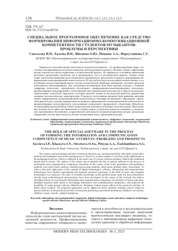 Творческая и исполнительская деятельность педагогов-музыкантов - это профессиональная сфера с достаточно консервативными методами и приемами, используемыми в процессе обучения. Однако современные реалии повсеместно вносят коррективы в педагогический процесс, что выражается в активном применении различных программных продуктов, как в традиционном, так и в дистанционном формате. Авторы статьи ставят своей целью выявление роли специального программного обеспечения в процессе формирования информационно-коммуникационной компетентности. В ходе работы были использованы количественные и качественные методы (факторный анализ, методы статистической обработки, наблюдение, изучение продуктов деятельности, прогнозирование). Для достижения поставленной цели были изучены подходы к понятиям «цифровые технологии», «программное обеспечение», «информационно-коммуникационные технологии», проанализирован международный и отечественный опыт практической деятельности в области музыкально-компьютерных технологий, определено состояние научного знания по исследуемой проблеме, разработаны основные методологические характеристики. В процессе исследования авторами были выявлены критерии оценки информационно-коммуникационной компетентности бакалавра музыкального образования, определены практические задания, направленные на развитие информационно-коммуникационной компетентности, проанализирована целесообразность использования специального программного обеспечения (MuseScore, музыкальный редактор Steinberg Cubase) в практической деятельности будущих учителей музыки. Предложенные подходы могут найти свое применение в учебных курсах студентов-музыкантов, связанных со специальным программным обеспечением, в практической деятельности музыкантов-практиков детских дошкольных учреждений, детских школ искусств, детских музыкальных школ, учреждений культуры.