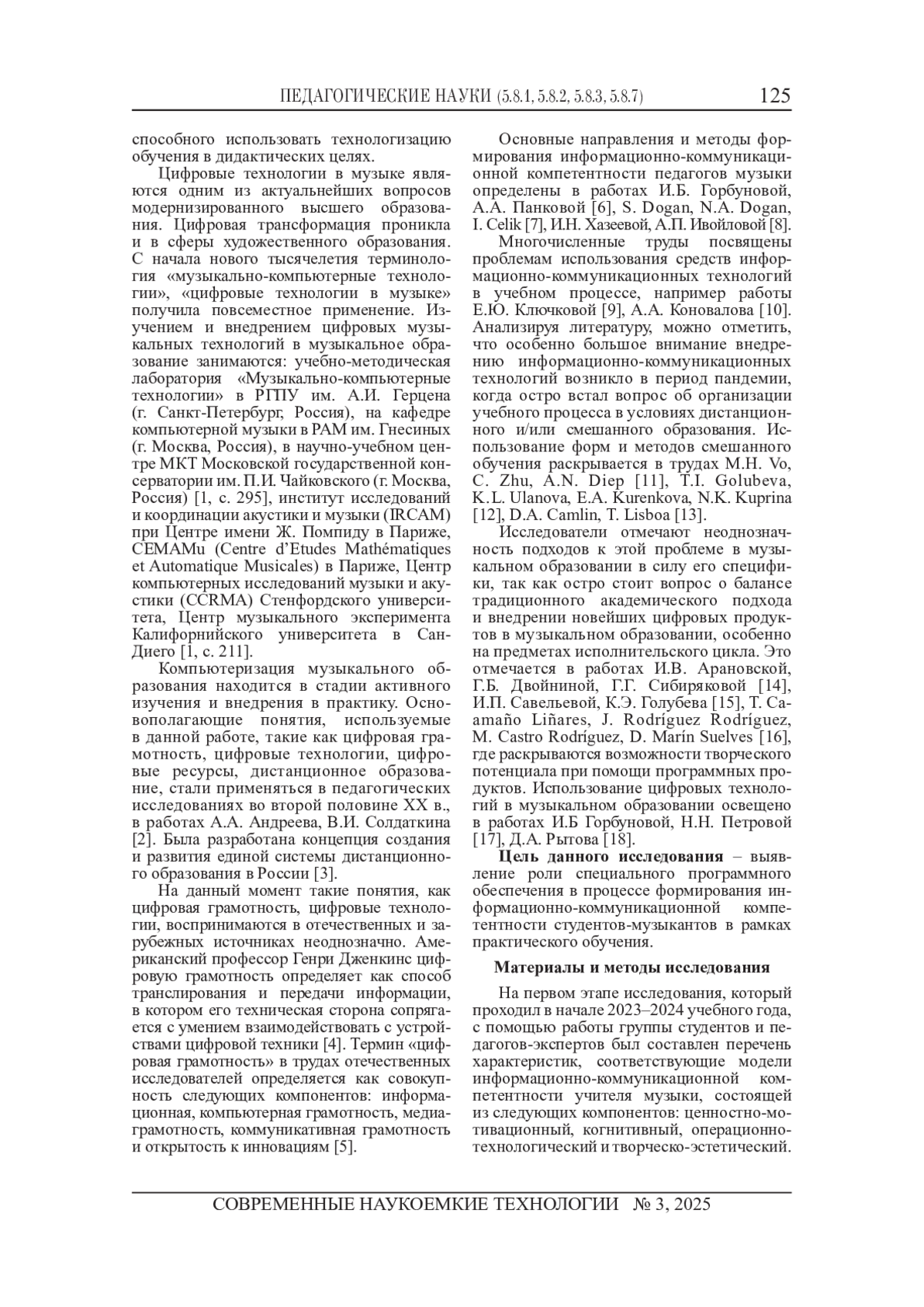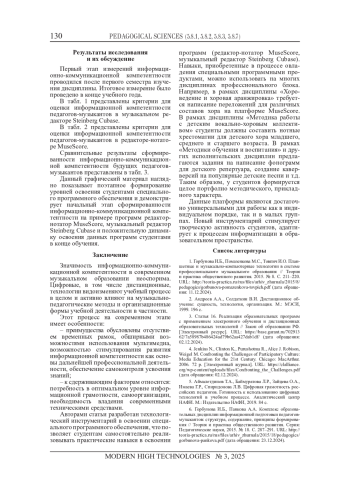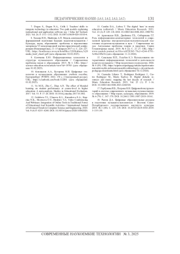 5. Аймалетдинов Т.А., Баймуратова Л.Р., Зайцева О.А., Имаева Г.Р., Спиридонова Л.В. Цифровая грамотность российских педагогов. Готовность к использованию цифровых технологий в учебном процессе. Аналитический центр НАФИ. М.: Издательство НАФИ, 2019. 84 с. 6. Горбунова И.Б., Панкова А.А. Комплекс образовательных дисциплин информационной подготовки педагогов-музыкантов: структура, содержание, принципы формирования // Теория и практика общественного развития. Серия: Педагогические науки, 2015. № 18. С. 287-291. URL: http://teoria-practica.ru/rus/files/arhiv_zhurnala/2015/18/pedagogics/gorbunova-pankova.pdf (дата обращения: 23.12.2024).