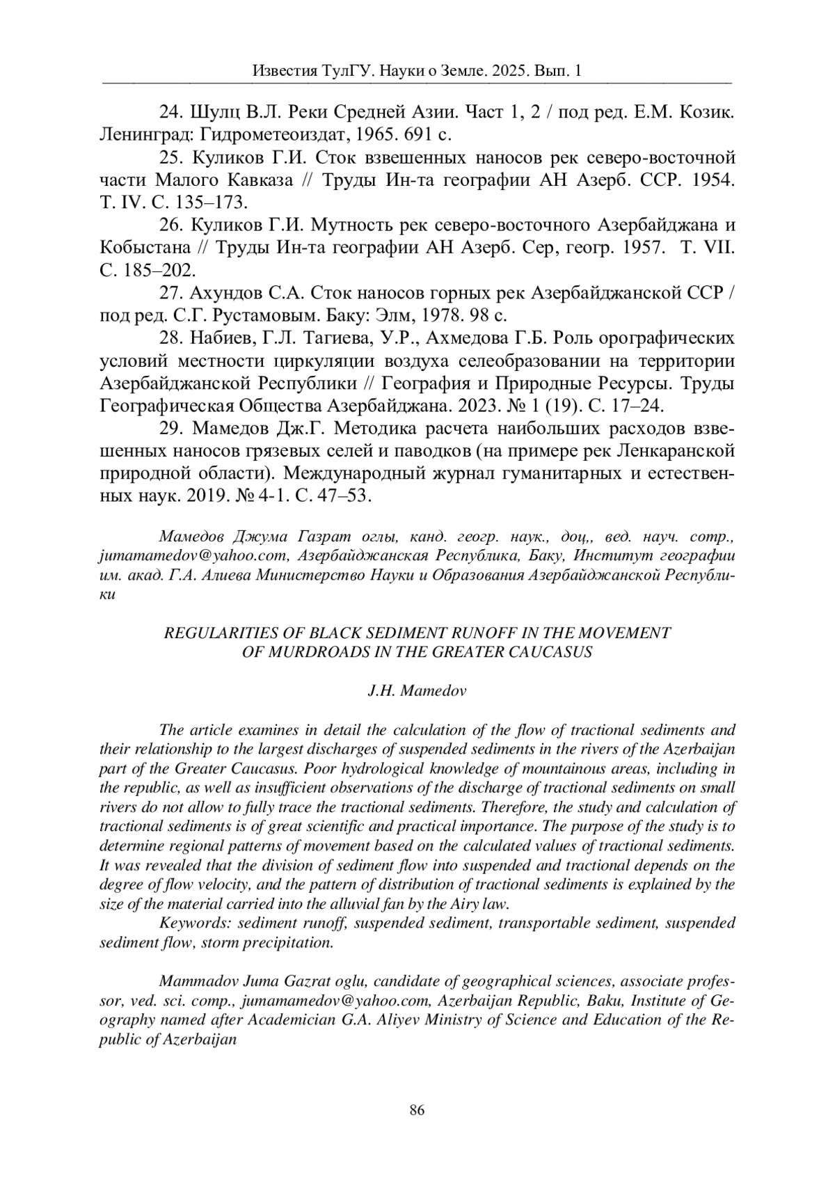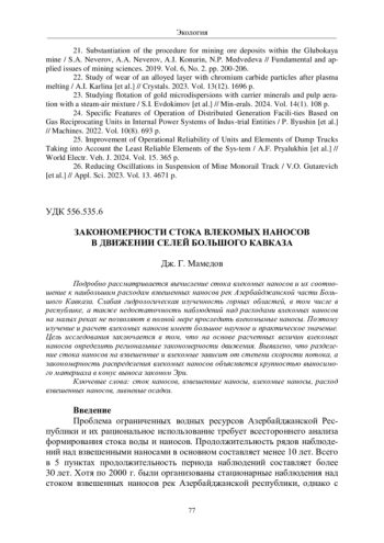 2. Мамедов Дж. Г.Новый подход в расчете наибольших расходов взвешенных наносов грязевых селей с учетом влияния основных природных факторов (на примере рек Малого Кавказа) // Вестник Геонаук, Сыктывкар. 2020. № 10. C. 31-37. EDN: ENCRUG