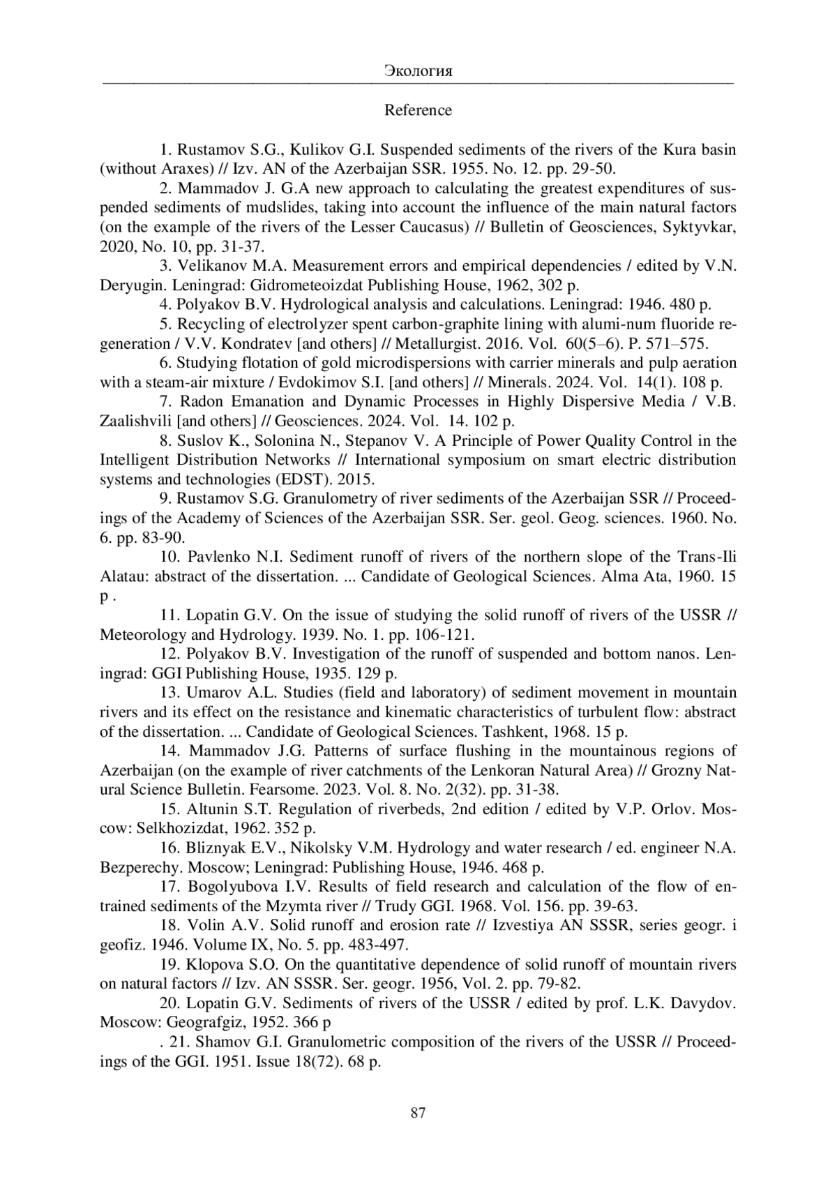 1. Рустамов С.Г., Куликов Г.И. Взвешенные наносы рек басейна Куры (без Аракса) // Изв. АН Азерб. ССР. 1955. № 12. С. 29-50.