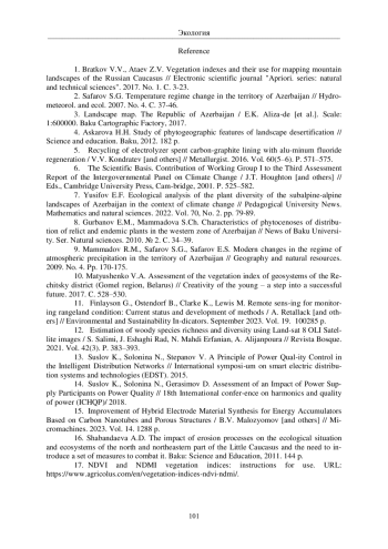 На основе спутниковых снимков Landsat 5, Landsat 8 за 2000, 2020 годы отслеживалась динамика NDVI (нормализованный разностный вегетационный индекс) и NDMI (нормализованный разностный индекс влажности) высокогорных ландшафтов северо-восточного склона Малого Кавказа в пределах Азербайджанской Республики. Методологическая суть исследования заключается в изучении динамики и статистической связи вегетационных индексов (NDVI, NDMI) ландшафтных комплексов (внутри полу типов и видов) территории. В исследованиях использовались аэрокосмические, картографические, исследовательско-аналитические методы. Все анализы NDVI, NDMI, проведенные в статье, основаны на статистических показателях цифровых карт и таблиц. Для определения общего фона NDVI и NDMI территории проводилась группировка по значениям обоих индексов. Согласно результату, в 2000 году преобладали засушливые территории, в 2020 году - влажные. За 20 лет площадь пустующих земель, разреженного травяного покрова уменьшилась, а площадь пастбищ и зарослей, редколесья и кустарников средней густоты увеличилась. Статистические результаты сравнительного анализа обоих индексов подтверждают корреляцию между NDVI и NDMI. Полученные результаты могут быть полезны для сохранения биоразнообразия экосистем высокогорных ландшафтов и оценки экологической обстановки.