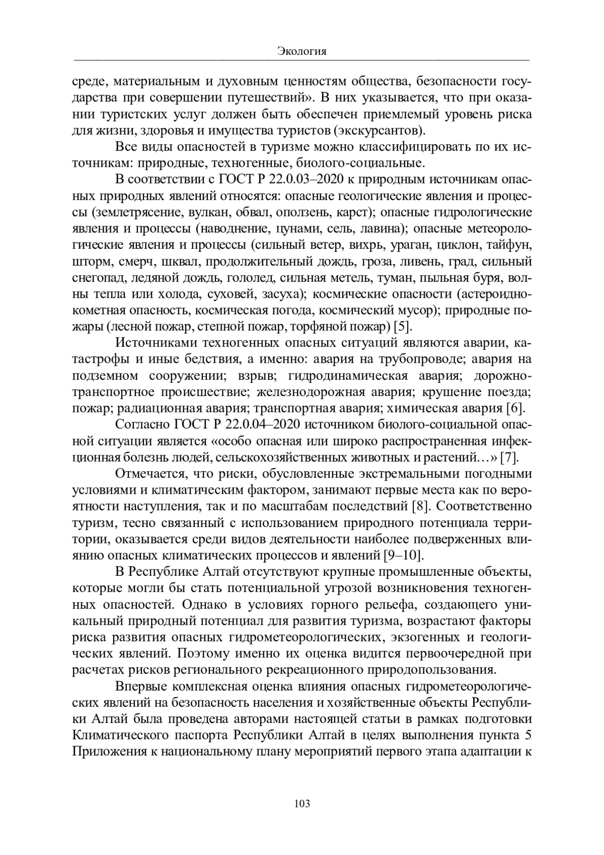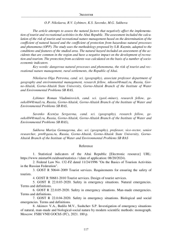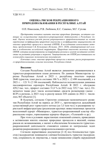 Предпринята попытка оценить опасные природные факторы, негативно влияющие на осуществление туристско-рекреационной деятельности в Республике Алтай. Оценка включила расчет рисков рекреационного природопользования на основе определения коэффициента природной опасности и коэффициента защищенности от опасных природных процессов и явлений (ОППЯ). В исследовании использована методика, предложенная С. Б. Кузьминым (Кузьмин, 2015; 2020), адаптированная под условия и особенности исследуемой территории. Природная опасность включила оценку ОППЯ, которые распространены на территории региона и имеют негативное воздействие на развитие рекреации и туризма. Защищенность от ОППЯ рассчитывалась на основе ряда социально-экономических показателей.