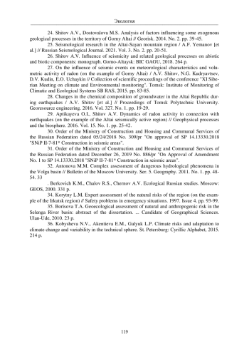 26. Шитов А.В. Влияние сейсмичности и связанных с ней геологических процессов на абиотические и биотические компоненты: монография. Горно-Алтайск: БИЦ ГАГУ, 2018. 264 с. EDN: YOPPQD