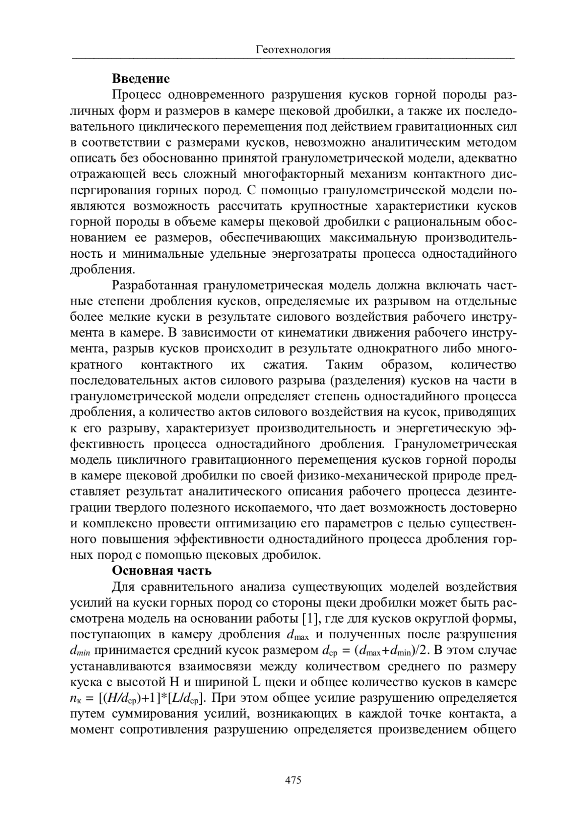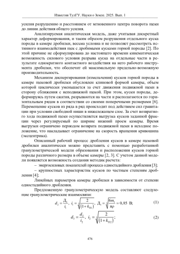 Процесс одновременного разрушения кусков горной породы различных форм и размеров в камере щековой дробилки, а также их последовательного циклического перемещения под действием гравитационных сил в соответствии с размерами кусков, невозможно аналитическим методом описать без обоснованно принятой гранулометрической модели, адекватно отражающей весь сложный многофакторный механизм контактного диспергирования горных пород. С помощью гранулометрической модели появляются возможность рассчитать крупностные характеристики кусков горной породы в объеме камеры щековой дробилки с рациональным обоснованием ее размеров, обеспечивающих максимальную производительность и минимальные удельные энергозатраты процесса одностадийного дробления.