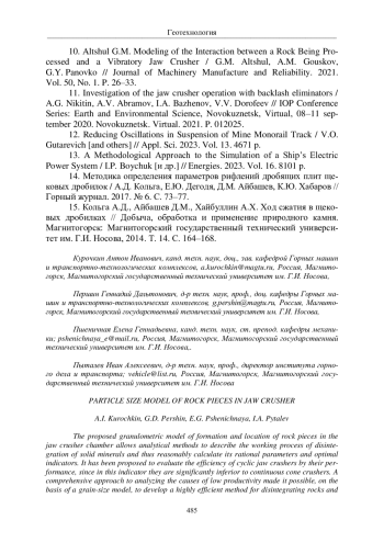 10. Altshul G.M. Modeling of the Interaction between a Rock Being Processed and a Vibratory Jaw Crusher / G.M. Altshul, A.M. Gouskov, G.Y. Panovko // Journal of Machinery Manufacture and Reliability. 2021. Vol. 50, No. 1. P. 26-33. EDN: TRXRSX