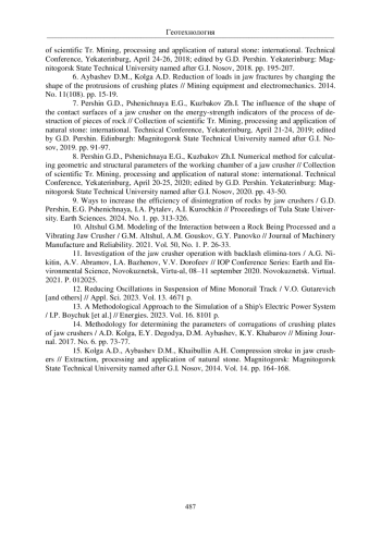 14. Методика определения параметров рифлений дробящих плит щековых дробилок / А.Д. Кольга, Е.Ю. Дегодя, Д.М. Айбашев, К.Ю. Хабаров // Горный журнал. 2017. № 6. С. 73-77.