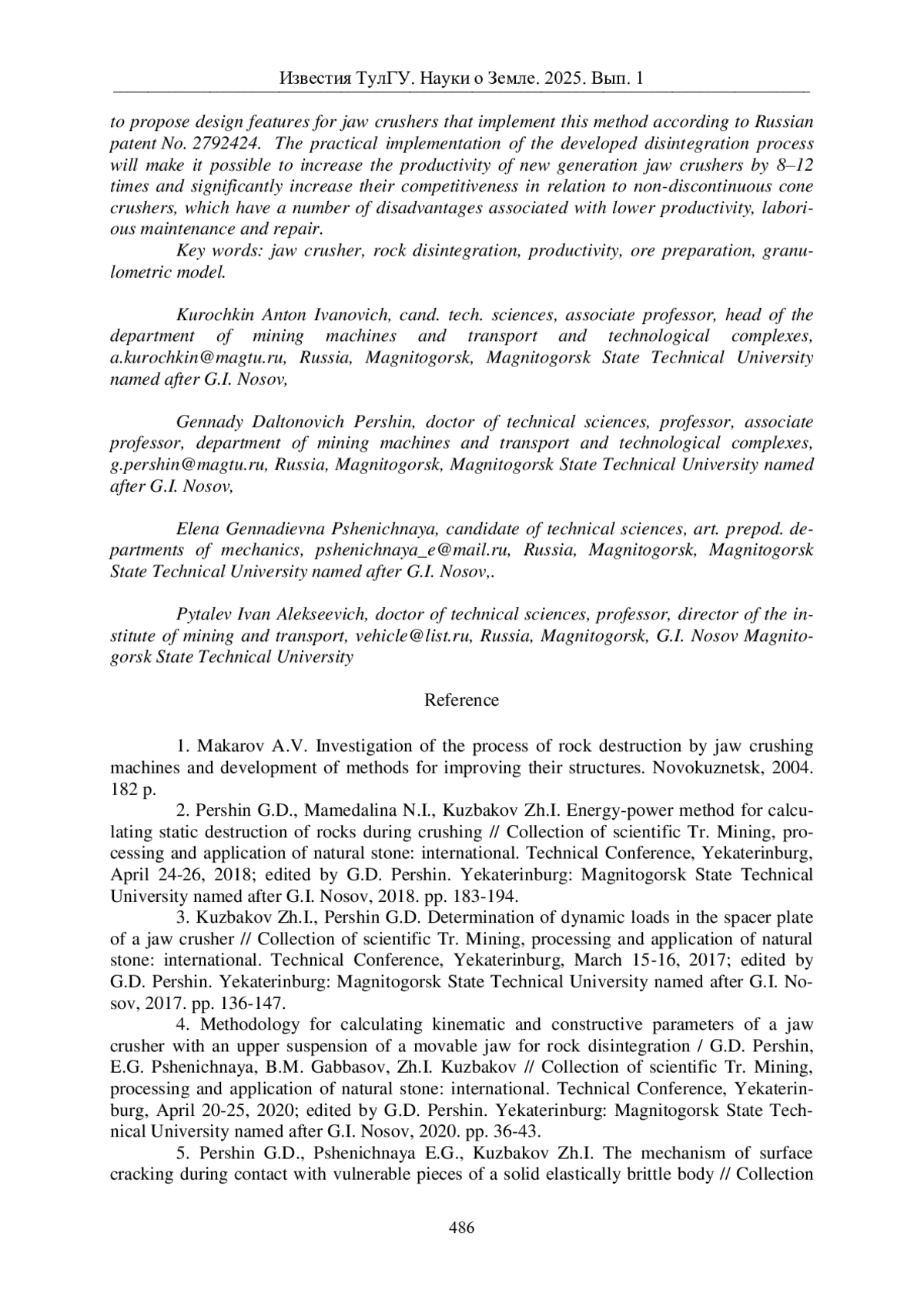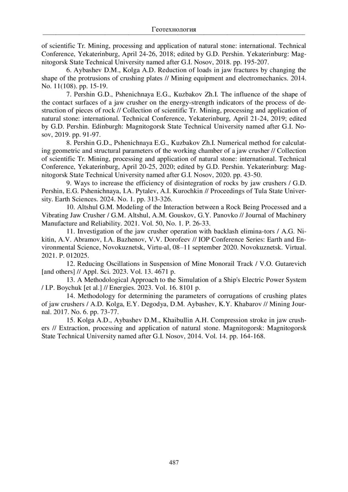 7. Першин Г.Д., Пшеничная Е.Г., Кузбаков Ж.И. Влияние формы контактных поверхностей щековой дробилки на энергосиловые показатели процесса разрушения кусков горной породы // Сб. науч. тр. Добыча, обработка и применение природного камня: междунар. технич. конф., Екатеринбург, 21-24 апреля 2019 г. / под ред. Г.Д. Першина. Екатеринбург: Магнитогорский государственный технический университет им. Г.И. Носова, 2019. С. 91-97.
