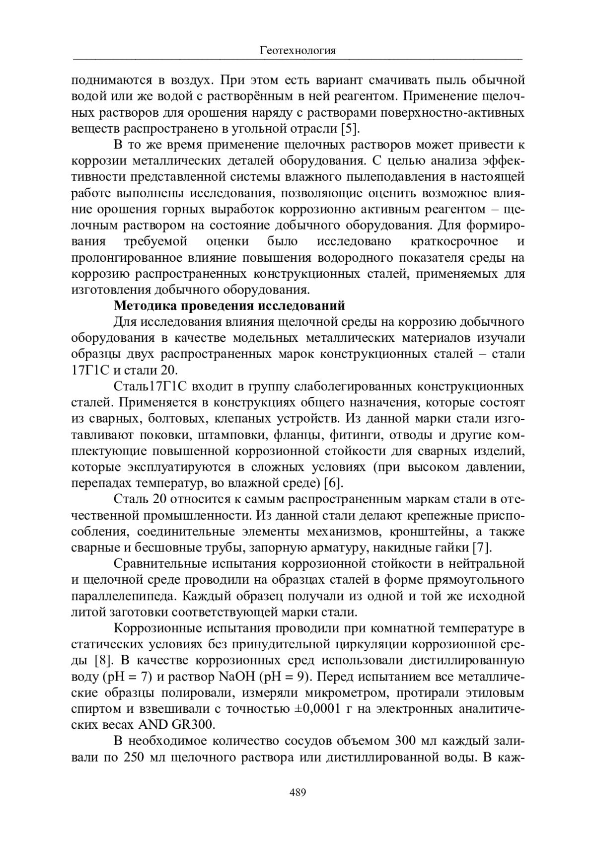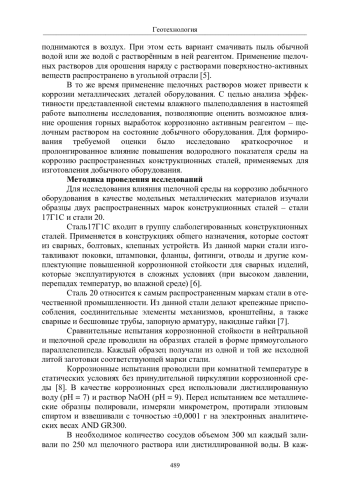 Исследовано влияние пылеподавления методом орошения горных выработок щелочным раствором на коррозию добычного оборудования. В качестве модельных металлических материалов использовали распространенные конструкционные стали марок 17Г1С и 20. Установлено, что изученные образцы стали 17Г1С в случае воздействия как нейтральной, так и слабощелочной среды относятся к условной группе «коррозионно стойкие». При этом повышение водородного показателя до значения рН = 9 вызывает четкую тенденцию снижения коррозионной стойкости данной стали внутри группы. В свою очередь, по результатам коррозионных испытаний сталь 20 в слабощелочной среде уже относится к категории металлических материалов «понижено стойкие».