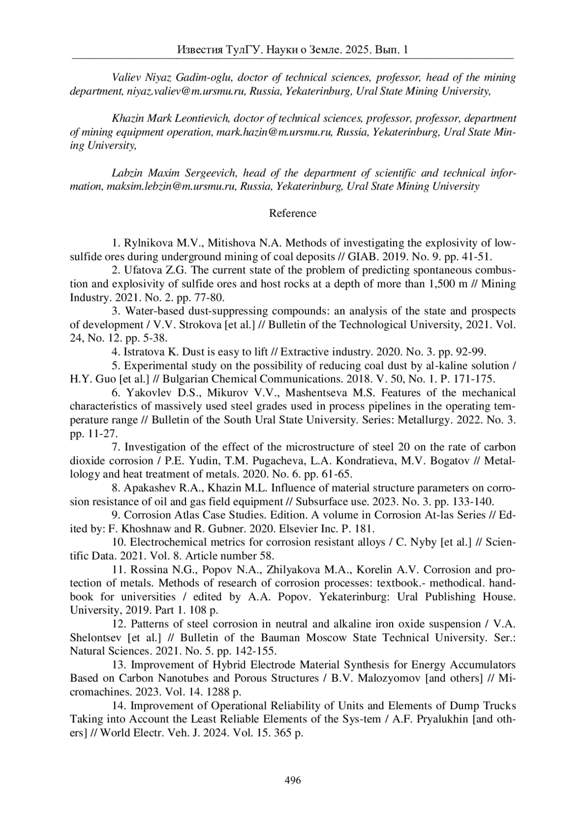 2. Уфатова З.Г. Современное состояние проблемы прогнозирования самовозгорания и взрывчатости сульфидных руд и вмещающих пород на глубине более 1500 м // Горная Промышленность. 2021. № 2. С. 77-80. EDN: XHCCTA