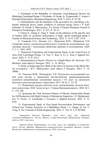 10. Тимохин Ю.В., Паламарчук Т.Н. Результаты исследований осевой силы ротора и параметров автоматических уравновешивающих устройств центробежных секционных насосов // Сб. науч. тр. Донецкого института железнодорожного транспорта. 2017. № 45. С. 32-42.