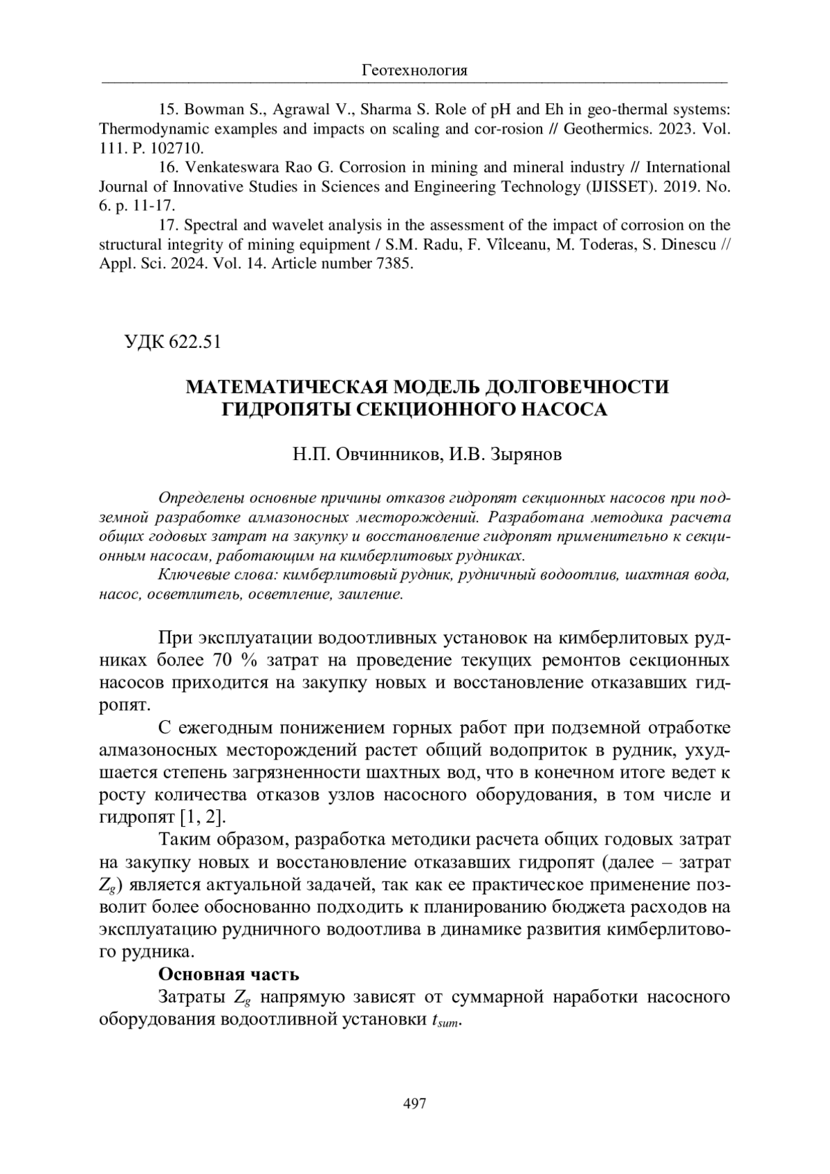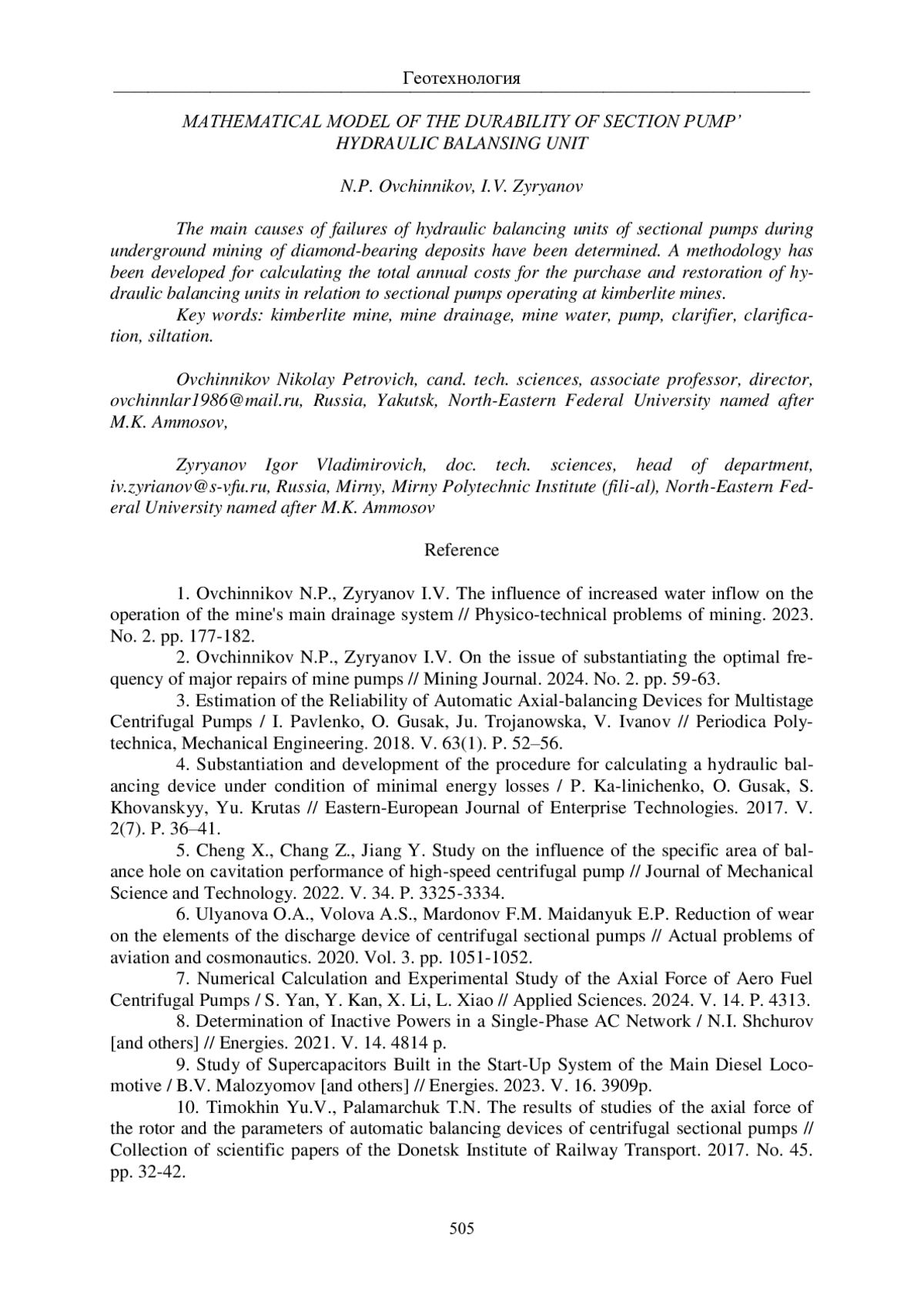 2. Овчинников Н.П., Зырянов И.В. К вопросу обоснования оптимальной периодичности проведения капитального ремонта шахтных насосов // Горный журнал. 2024. № 2. С. 59-63. EDN: LYRSMB