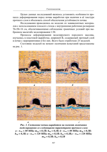 Приведены результаты лабораторных исследований на моделях из эквивалентных материалов. Установлено, что деформирование пород почвы с прочным слоем происходит в два этапа: на 1-м этапе - складкообразование слоев происходит только над прочным слоем; на 2-м этапе - происходит изгиб и разлом прочного слоя и увеличение смещений пород почвы. При наличии в почве выработки, шириной В, слоя прочных пород толщиной 0,1B наибольший положительный эффект от него достигается, если располагать выработку относительно вмещающих пород, так чтобы прочный слой залегал как можно дальше от контура почвы, но не более 0,5B, а при толщине слоя 0,3В, чтобы прочный слой залегал как можно ближе к контуру почвы выработки. С целью уменьшения смещений пород почвы, необходимо дополнительное внешнее воздействие на прочный слой до наступления второго этапа деформирования.