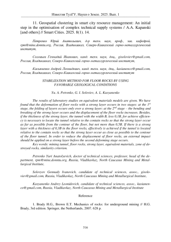 Результаты. Сформулирована проблема доработки Садонских месторождений с обеспечением устойчивости горных пород и безопасность работающих. Дана справка о геологическом строении месторождений с детализацией условий перспективного Джимидонского месторождения. Приведены результаты измерений трещиноватости пород, скорости упругих волн в породах и свойства пород. Установлена закономерная взаимозависимость прочности на сжатие и скорости распространения волн, а так же от степени развития упругих деформаций и пористости. Приведены сведения о крепости структурном ослаблении наиболее представительных пород месторождения. Показано, что между работой деформации и общей работой разрушения. Подтверждено, что сцепление пород возрастает по параболическому закону от минимального на контуре шпура до максимального значения в ненарушенном массиве, на основе чего производится оценка устойчивости обнажений пород. Предложена типизация пород с дифференциацией на категории и указаны примерные значения напряжений и смещения частиц. Построен график зависимости зоны неупругих деформаций от глубины заложения выработки дифференцированно для пород различной устойчивости. Показано, что освоение новых технологий с выщелачиванием нуждается в геомеханическом обосновании. Отмечено, что результаты исследования могут быть востребованы при подземной разработке месторождений полезных ископаемых. Сделан вывод, что возобновление или активизация добычных работ возможно при модернизации теории и практики управления массивами.