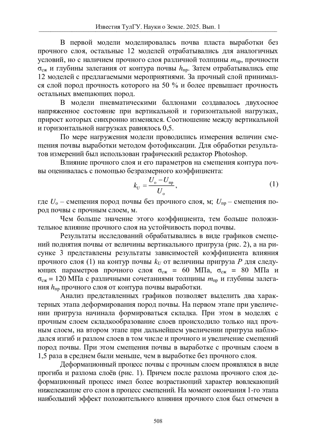 Обзор исследований [1–5] по обеспечению устойчивости выемочных выработок показывает, что вопросу влияния текстуры пород на процесс деформирования почвы выработок уделялось недостаточное внимание. При наличии в текстуре почвы прочного слоя пород их разрушение происходит в результате развития породной складки с образованием крупных породных блоков [3, 4]. В таких условиях производить механизированную поддирку затруднительно, а зачастую и невозможно. При этом прочность пород для механизированной поддирки должна составлять не более 60 МПа. Выше этого предела при поддирке почвы необходимо применять буровзрывные работы, что повышает энергозатраты на разрушение пород и снижает темпы работ более чем в 5 раз [5]. Кроме того, не рассматривался вопрос использования несущей способности прочного слоя в почве выработки для повышения её устойчивости.