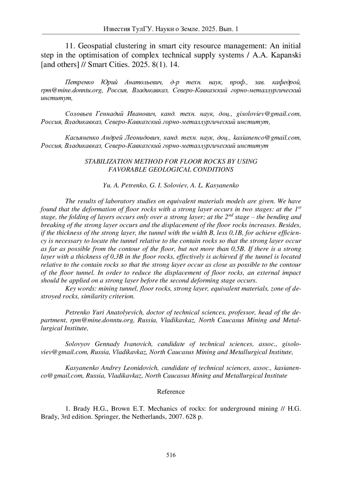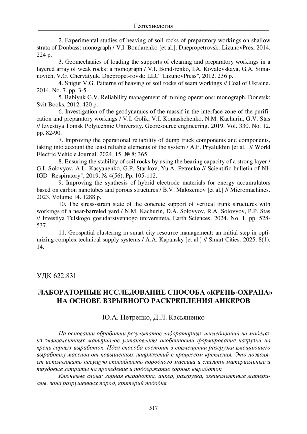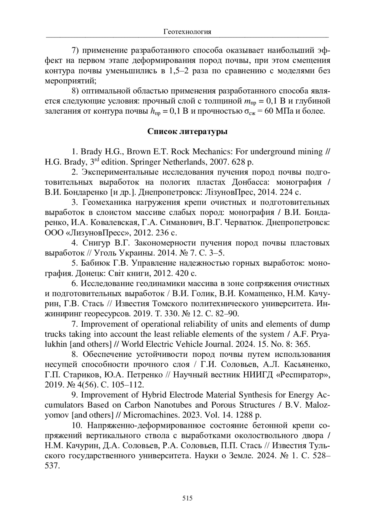 8. Обеспечение устойчивости пород почвы путем использования несущей способности прочного слоя / Г.И. Соловьев, А.Л. Касьяненко, Г.П. Стариков, Ю.А. Петренко // Научный вестник НИИГД “Респиратор”, 2019. № 4(56). С. 105-112.
