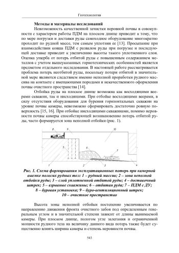 Рассматривается проблема неполной отбойки руды в основании камер с плоским днищем при отработке пологозалегающих месторождений с ограниченной мощностью рудных тел. Определено, что показатели эксплуатационных потерь во многом определяются качеством оформления плоского днища. Разработана методика оценки показателей ущерба, отличающаяся учетом генерального угла формирования и максимальной высоты зоны неполной отбойки. Предложен способ расчета объективного показателя неровности почвы очистного пространства - коэффициента, выражающегося разностью единицы и отношения объема неровности к среднему объему сегмента зоны неполной отбойки вмещающего неровность, ограниченного по длине величиной линии наименьшего сопротивления и по ширине расстоянием между концами скважин. С учетом влияния горнотехнических особенностей камерной выемки с плоским днищем в условиях отработки пологих рудных тел, установлены зависимости объема теряемой неотбитой руды от основных конструктивных параметров выемочной единицы - длины и ширины камер. Оценен средний годовой прогнозный ущерб от некачественного оформления плоского днища.