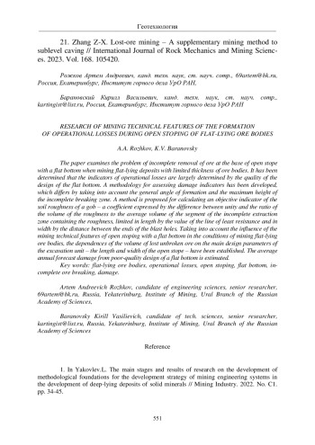 21. Zhang Z-X. Lost-ore mining - A supplementary mining method to sublevel caving // International Journal of Rock Mechanics and Mining Sciences. 2023. Vol. 168. 105420. EDN: NBVEOI