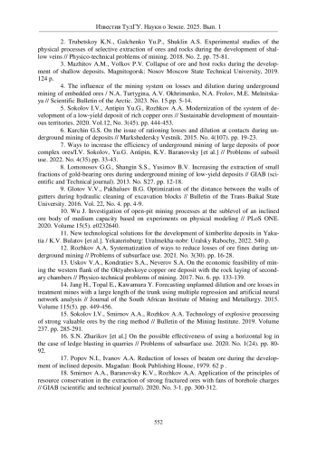 1. Яковлев В.Л. Основные этапы и результаты исследований по разработке методологических основ стратегии развития горнотехнических систем при освоении глубокозалегающих месторождений твердых полезных ископаемых // Горная промышленность. 2022. № S1. С. 34-45. EDN: VAOOGJ