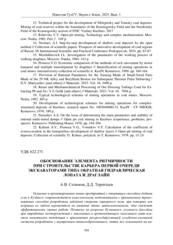 9. Демченко А.В., Ермолаев В.А., Федотенко С.М. Поэтапно-углубочная технология интенсивной отработки угольных пластов для условий разреза “Краснобродский” // Уголь. 1997. № 1. C. 21-22.