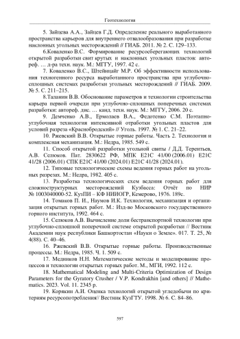 5. Зайцева А.А., Зайцев Г.Д. Определение реального выработанного пространства карьеров для внутреннего отвалообразования при разработке наклонных угольных месторождений // ГИАБ. 2011. № 2. C. 129-133.