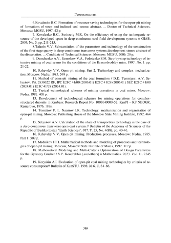 6. Коваленко B.C. Формирование ресурсосберегающих технологий открытой разработки свит крутых и наклонных угольных пластов: автореф.. д-ра техн. наук. М.: МГГУ, 1997. 42 с.