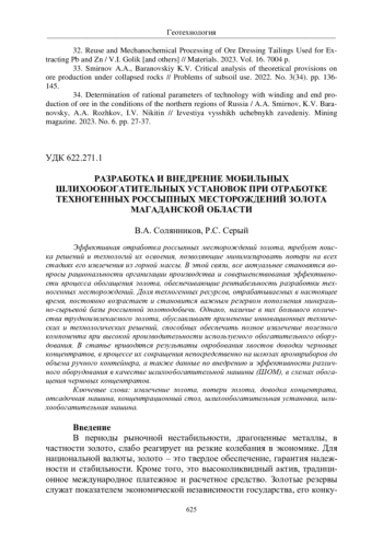 5. Серый Р.С. Снижение потерь золота на шлюзовых промывочных приборах при отработке труднообогатимых россыпей // Маркшейдерия и недропользование. 2014. № 6 (74). С. 20-22. EDN: SYMWSZ