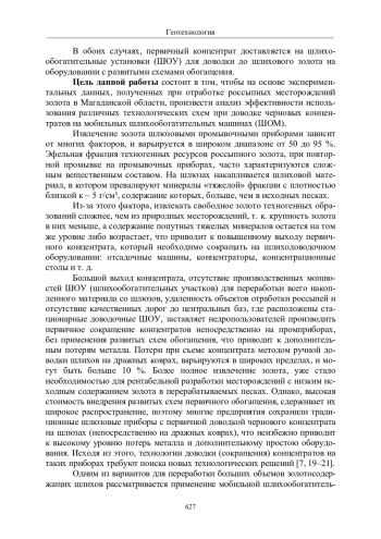 Эффективная отработка россыпных месторождений золота, требует поиска решений и технологий их освоения, позволяющие минимизировать потери на всех стадиях его извлечения из горной массы. В этой связи, все актуальнее становятся вопросы рациональности организации производства и совершенствования эффективности процесса обогащения золота, обеспечивающие рентабельность разработки техногенных месторождений. Доля техногенных ресурсов, отрабатываемых в настоящее время, постоянно возрастает и становится важным резервом пополнения минерально-сырьевой базы россыпной золотодобычи. Однако, наличие в них большого количества трудноизвлекаемого золота, обуславливает применение инновационных технических и технологических решений, способных обеспечить полное извлечение полезного компонента при высокой производительности используемого обогатительного оборудования. В статье приводятся результаты опробования хвостов доводки черновых концентратов, в процессе их сокращения непосредственно на шлюзах промприборов до объема ручного контейнера, а также данные по внедрению и эффективности различного оборудования в качестве шлихообогатительной машины (ШОМ), в схемах обогащения черновых концентратов.