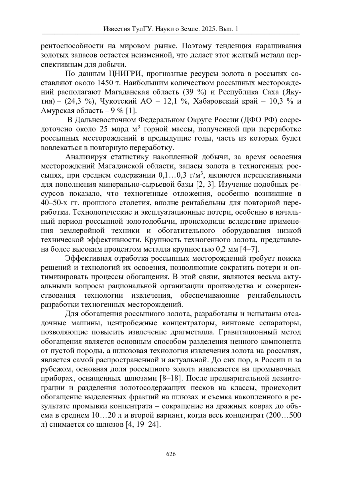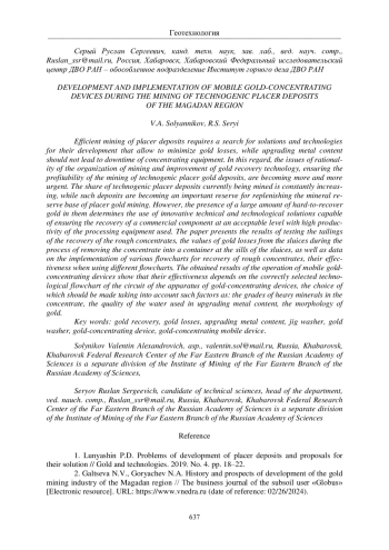 24. Алексеев В.С., Банщикова Т.С., Алексеева Е.В. Особенности техногенного золота отвальных комплексов Соловьевского золотоносного узла // ГИАБ. 2021. № 7. С. 134-145. EDN: XKFJMY