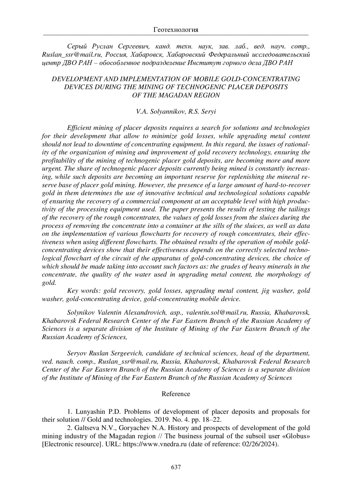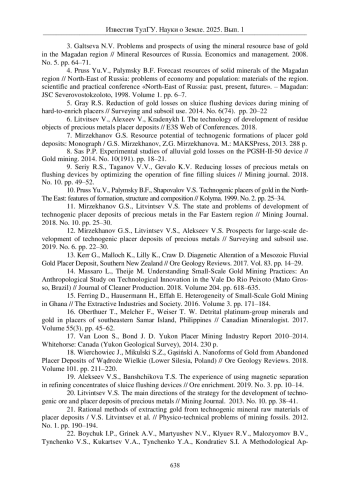 12. Мирзеханов Г.С., Литвинцев В.С., Алексеев В.С. Перспективы масштабного освоения техногенных россыпных месторождений благородных металлов // Маркшейдерия и недропользование. 2019. № 6. С. 22-30. EDN: LXVBRD