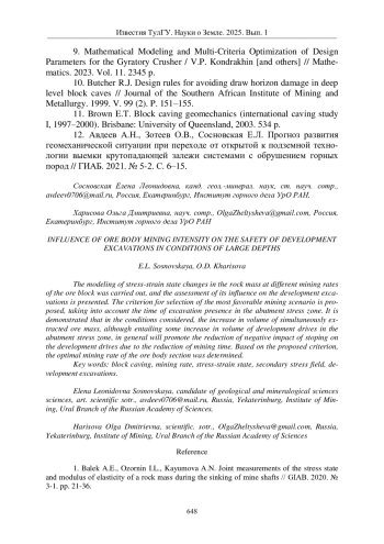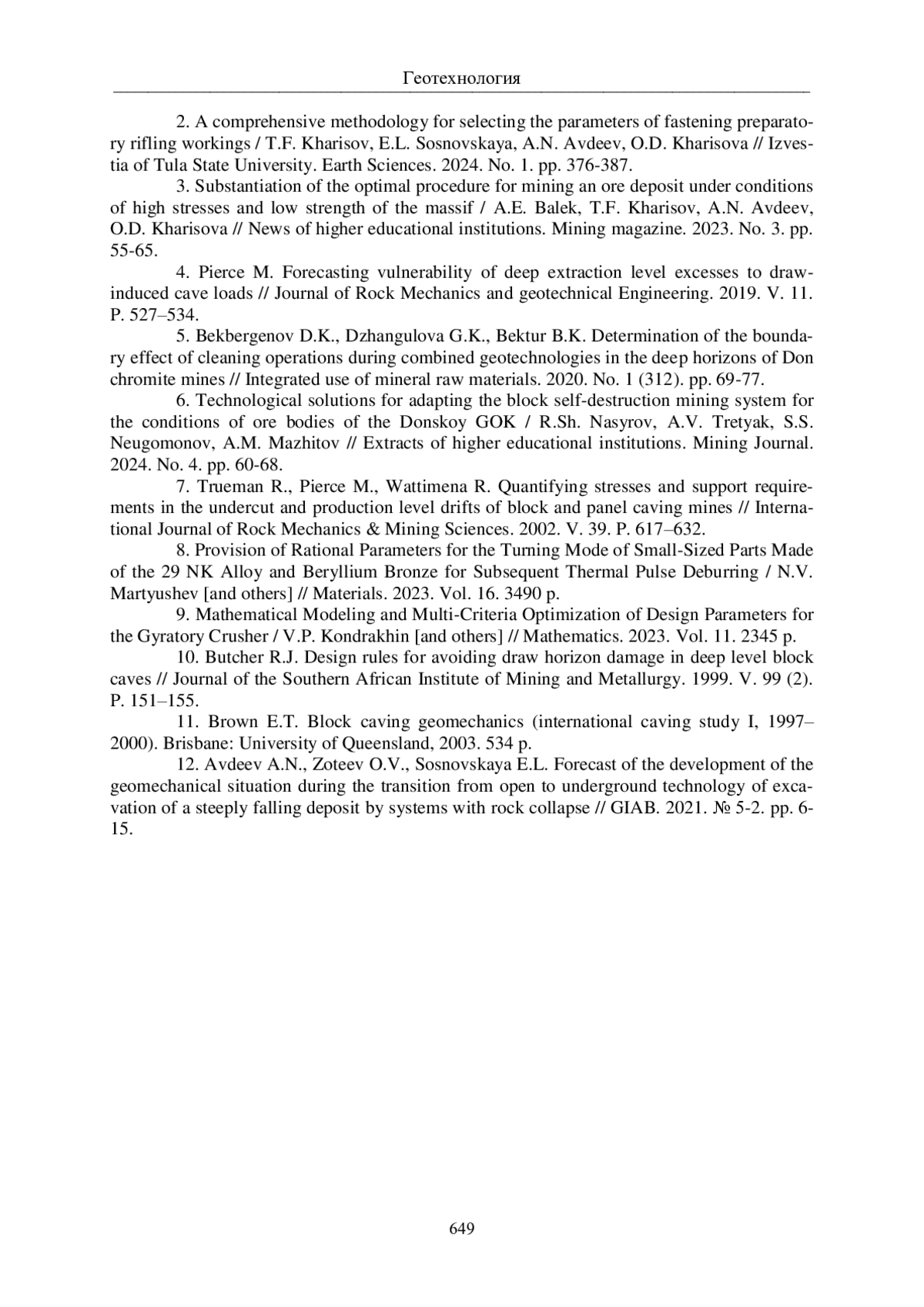 12. Авдеев А.Н., Зотеев О.В., Сосновская Е.Л. Прогноз развития геомеханической ситуации при переходе от открытой к подземной технологии выемки крутопадающей залежи системами с обрушением горных пород // ГИАБ. 2021. № 5-2. С. 6-15.