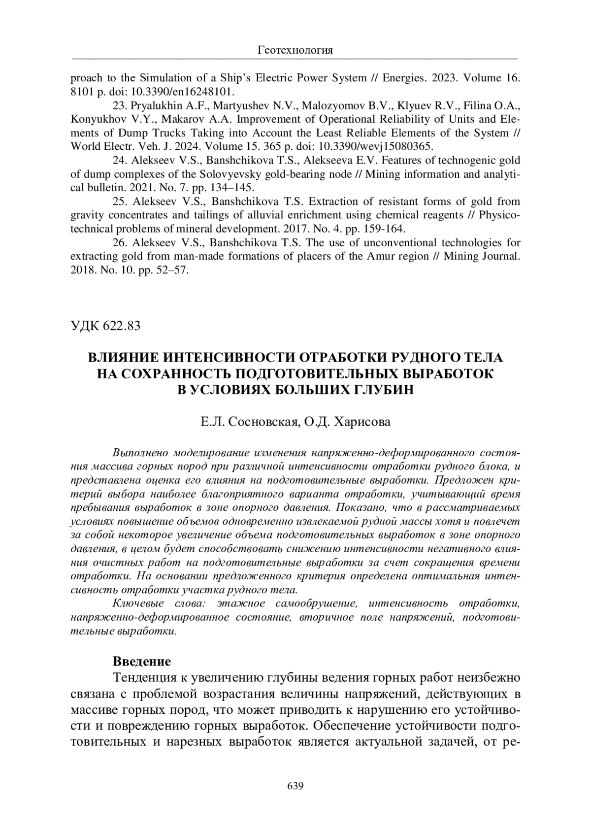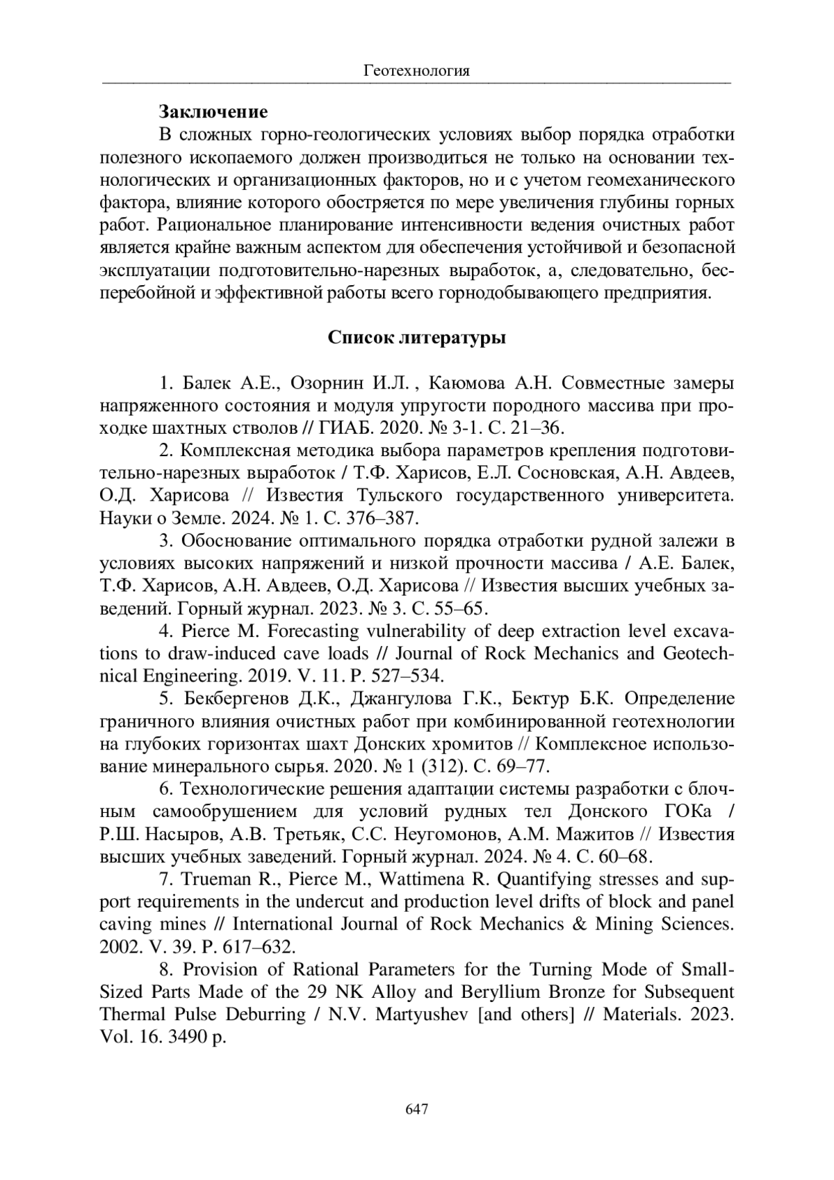 3. Обоснование оптимального порядка отработки рудной залежи в условиях высоких напряжений и низкой прочности массива / А.Е. Балек, Т.Ф. Харисов, А.Н. Авдеев, О.Д. Харисова // Известия высших учебных заведений. Горный журнал. 2023. № 3. С. 55-65. EDN: DZSHMG